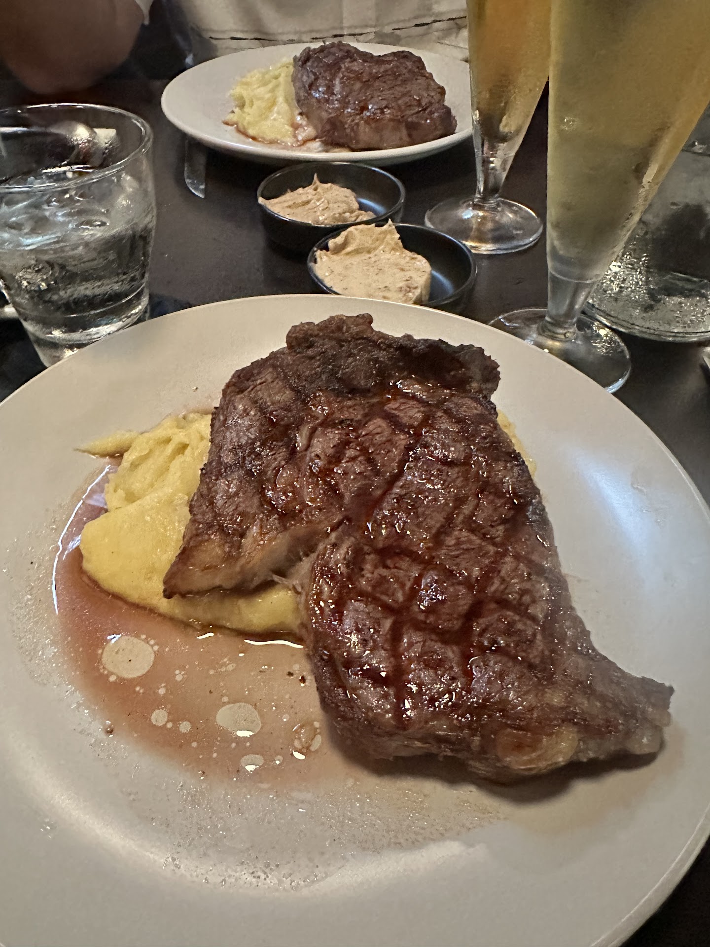 The wives had the Beef Wellington and us guys both had the Ribeyes. Tbh, that wasnât our first choice of steak, but they were out of the 12oz Dry Aged Prime Beeman Ranch Wagyu Ribeye. We were soooo looking forward to that!! So we just went with the 14oz Prime Angus Ribeye. We had drinks before and during dinner as well.