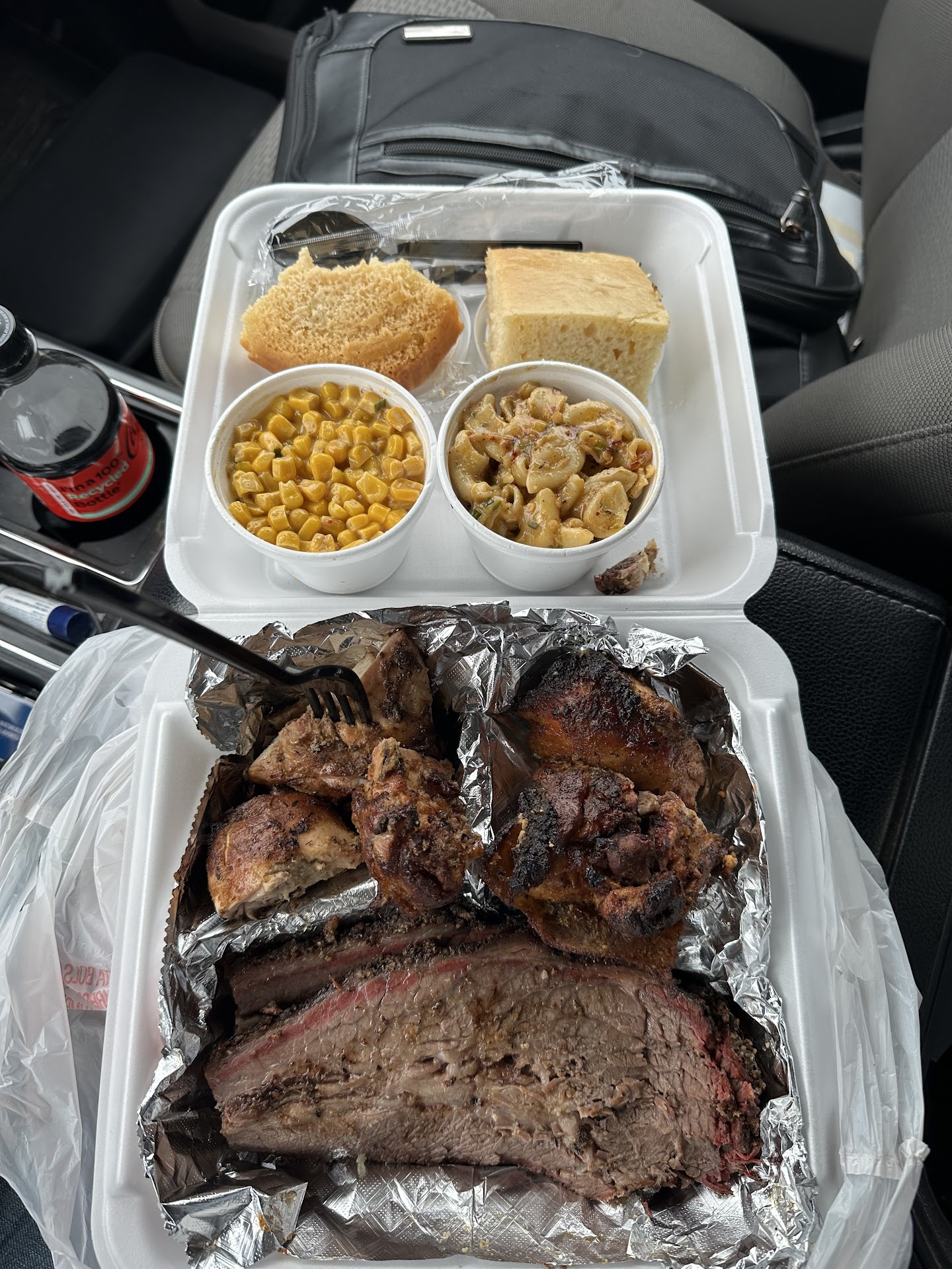 Read moreIf I could give the service 10 stars I would. Both of the guys working seemed genuinely happy to be serving people when I consider to be outstanding barbecue. I’ve eaten at every heralded barbecue place in Texas to include the Michelin star places in Austin. If you had a blind brisket test between this one and one of those, you likely, wouldn’t know the difference. Perfectly cooked with a perfectly smoked flavor. The chicken was different in a good way. Still smoked chicken with just the right amount of jerk flavor. The corn and bread were both outstanding and I would get them again. Mac & cheese was good, but it was a little too spicy for my pallet so I can’t give it a fair rating but that’s more about me than them. Very unassuming location inside a convenient store with a smoker on a trailer out front and as soon as you get out of your car and smell, the Smoke, you know they are doing it right. If you’re in the area and looking for barbecue, give these guys a shot and you won’t be...