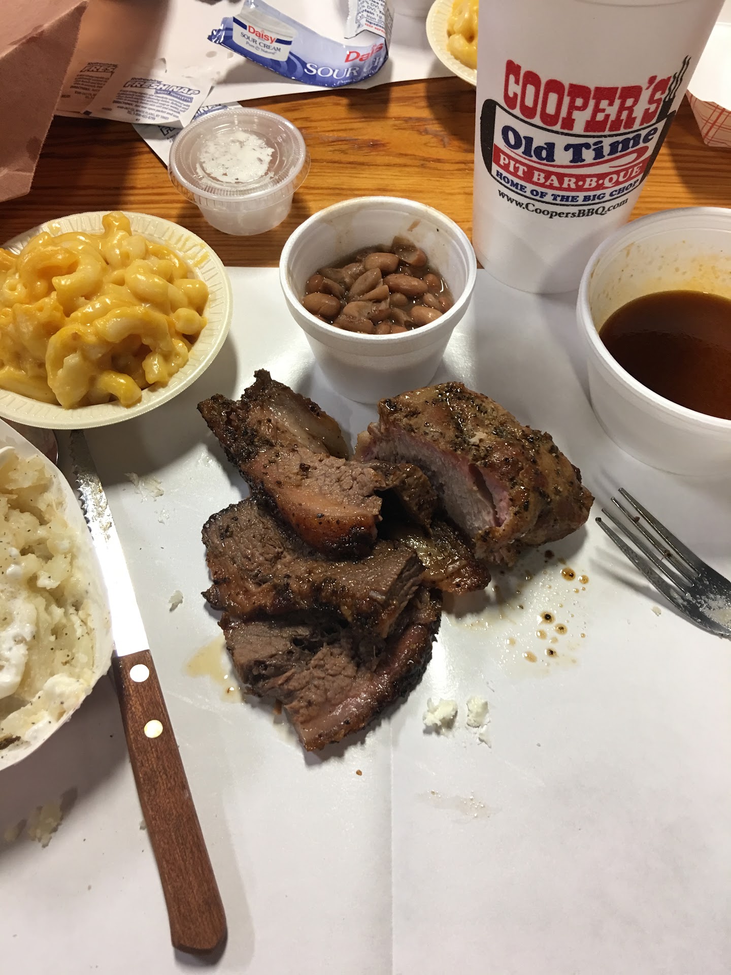 We were planning on going to Black's when we saw the sign for Cooper's so we decided to try it out instead. We loved the sausage and the chicken. I had the chopped beef baked potato which was really good. Asked for extra butter and the gentleman asked if I wanted extra cheese or bacon too because they didn't have a limit on them and I thought that was such a great touch! Only complaint is that the outside of the potato had a little too much salt and pepper. I loved that it was seasoned, because I like to eat the whole thing, but someone had a little bit of a heavy hand when it came to that. My husband said the brisket was okay, but he felt like it was missing something. He liked my chopped beef better than the brisket. He loved that the chicken was juicy and moist, especially the breast. We're big beef sausage eaters so we weren't sure if we would like theirs and we loved it. Kind of has a weiner aftertaste, but wasn't overpowering and was so good. Bought a couple of pork ribs but didn't get to try them because we were so full by the time we got to them. The potato salad was ok, but the beans were awesome! Loved that they were free and you could eat as much as you wanted. The sweet tea was perfect. It wasn't too sweet and was just so tasty. The pecan pie cobbler was ok, but I wouldn't buy again. Overall it was kind of pricey, over $75 for everything in the pics (missing the potato salad, cobbler and 2 drinks) and there was only 2 of us. We will come back, but maybe for a date night because it's just a little too pricey to come more often than that. Please open one in San Antonio!! Update: Tried the ribs they bombed The employee was pushing it on us too saying, "How about ribs? My last two!" My husband said ok so we could try it and we shouldn't have done it. We had so much food and we're so full, we brought it home without trying it there. BIG MISTAKE!!! There was barely any meat...and I mean BARELY! $18 for 2 bones??? I'm going to have to remove a star for that. We were so disappointed because we really...
