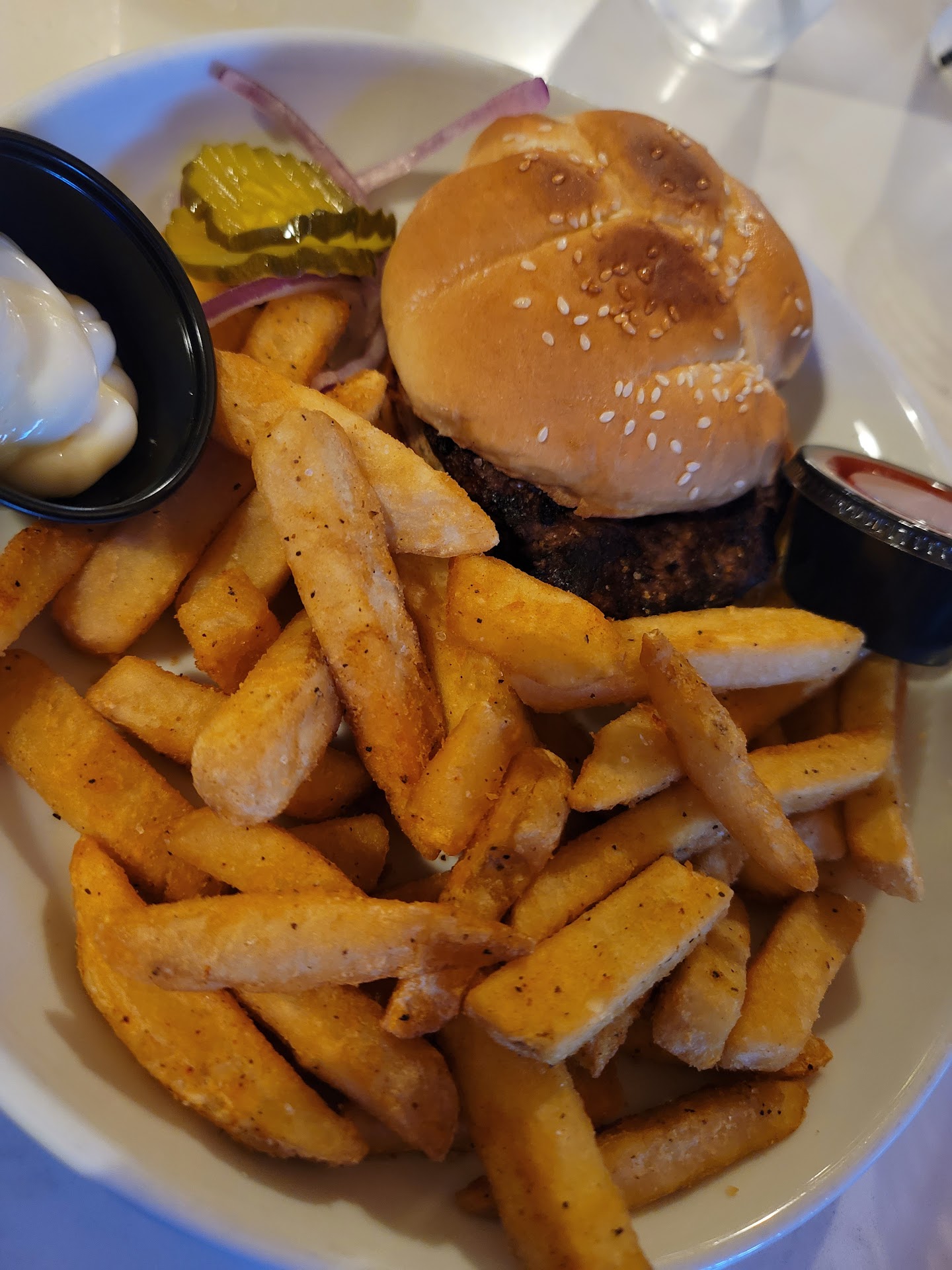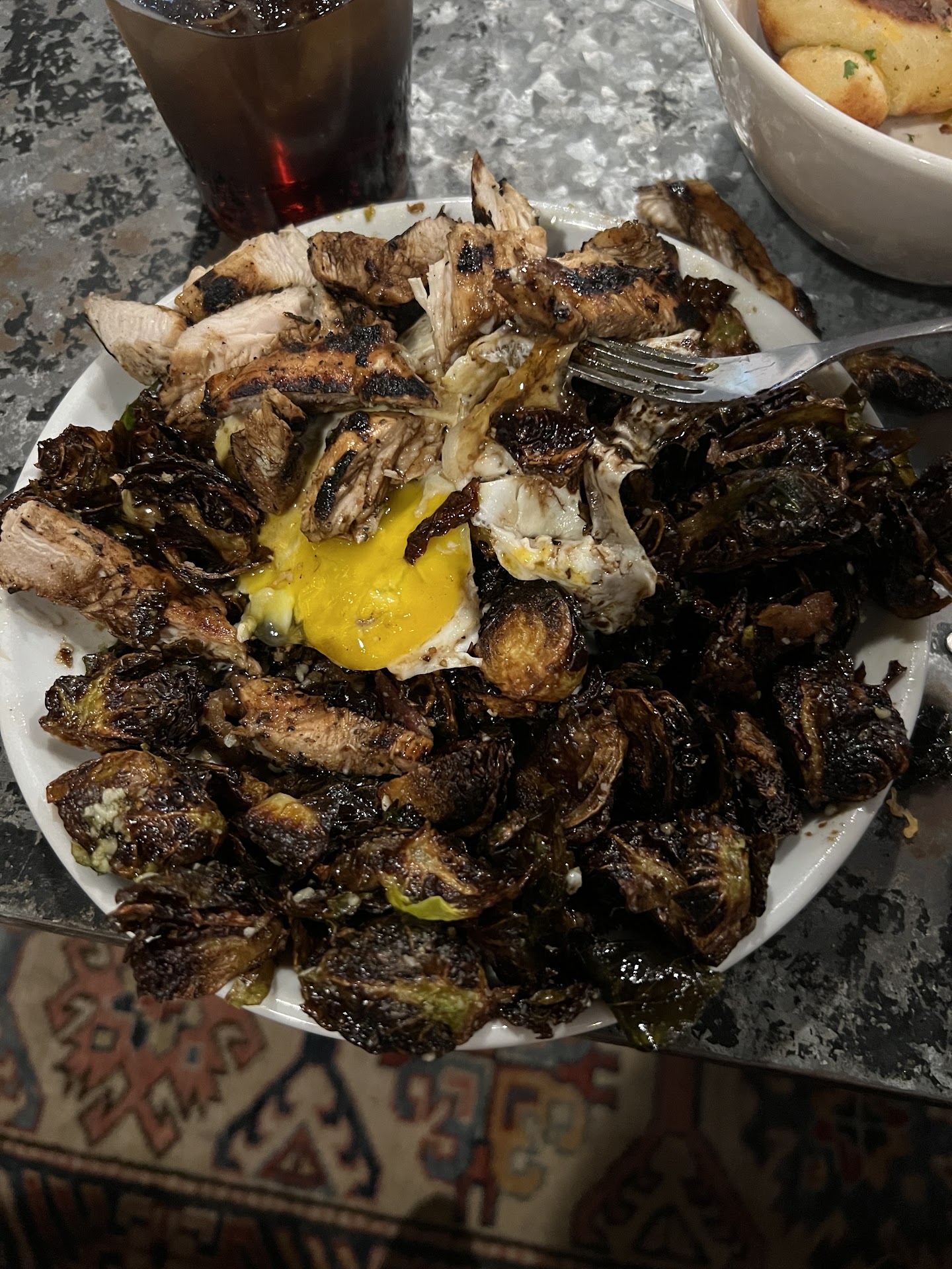 Read moreWe went there last night for a date night. We wanted a quiet but fun dinner. We have been here years ago & the menu has gone down hill & so has the kitchen staff apparently. There were also a whole lot of kids RUNNING everywhere. I felt bad for the hostess as she was playing babysitter & cattle herder all night. The parents were on the other side of the building & drinking, they didn’t seem to care that their kids were jumping on furniture. I would have been fine with that as that’s not the restaurants responsibility, also I was just tired from momming all day I didn’t want to have to yell at kids to calm down. Then my food which I thought was a simple order of bread knots for appetizer, BURNT. The waitress did offer to remake them but it was once they were mostly all eaten & we were full of burnt bread. Something to take note of before you take the food to customers. Then I ordered the Brussels sprout salad, it came completely burnt, with no bacon, hardly any cheese if any. The fried egg was over VERY EASY with the white part still runny. Even the grilled chicken was charred & burnt. Very unappetizing & made me feel worse than when I walked in. I ordered a kids chicken strip to just be safe after that & get something in my stomach. The whole time I saw the manager sitting at a table on her laptop. Never came to check on us, never offered anything but taking off the burnt food from our bill. I’m not happy & will never be back. The kitchen staff looked like a bunch of teens at a party, spending more time dancing & playing then paying attention to...