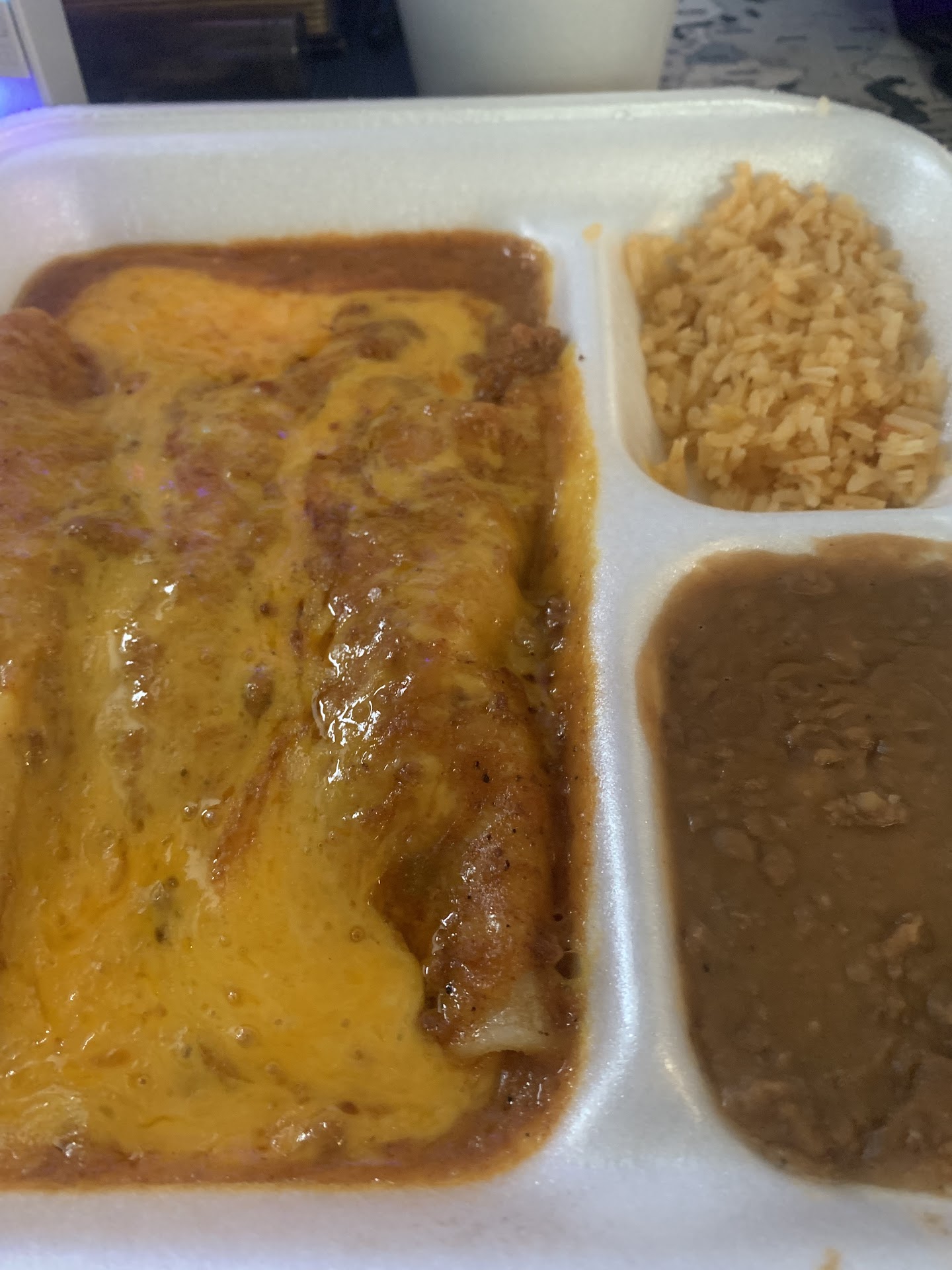 This place is bad with allergy cross-contamination. My boyfriend ordered steak fajitas with no cilantro on it for me, because I'm deathly allergic to it - I can't eat it, but I also can't even breathe the smell of it in without potentially going into anaphylaxis in a matter of seconds. The lady at the counter said the dish didn't come with cilantro in it. My boyfriend paid, got the food, and then looked at the food briefly and didn't immediately see anything, so he assumed it was safe. Once he got home with it (I can't go near the restaurant without having a reaction) and I opened it, I held my breath and thoroughly inspected everything. Upon flipping some pieces of meat and veggies over, I found a couple large pieces of cilantro and a big piece on one tortilla. My boyfriend wouldn't have even let me near it if he'd have known that there were leaves hidden underneath. Thank goodness it wasn't immediately fragrant because it was saturated in the juices of the meat - I closed the box right after opening it and seeing the pieces of cilantro, re-bagged it, double and then triple-bagged it in the trash, and we both had to wash our hands as well just in case. His enchiladas were fine, but they also gave a side dish of something that looked like chili that had green flecks (I could see the colors through the lid) of what looked to be the size and shape of chopped up bits of cilantro inside and I wasn't about to open that to find out.