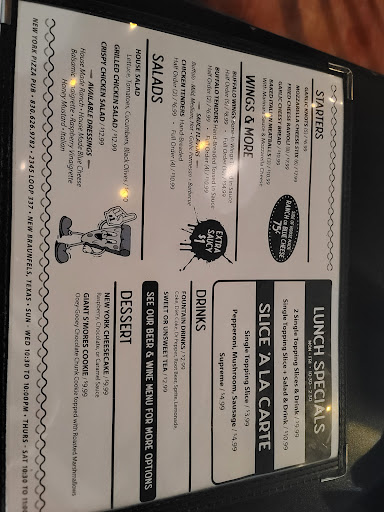 Read moreAs much as I love the food at New York Pizza Pub, I'm afraid this little restaurant is circling the drain. The quality is slipping (though it's still a pretty decent pizza), but service and wait times are just so long as to not make it worth our time to go there. We typically go there on Sunday after church, and often have another couple join us. When we went there two weeks ago, we noticed the wait time for a pizza was well over a half hour, and it took quite a bit of time to get our drinks. I wrote it off as a wait person taking off ill and they were short-staffed. However, when we went last Sunday, service was terrible. Keep in mind the waiter was going about as fast as he could, but there was only one waiter in the entire restaurant, with a helper who was pretty much clueless. Because we always get the same thing, I placed the full order as the waiter came by before I even sat down. It took 20 minutes to get our drinks, and we only got them when I went up and reminded the waiter we'd not received them. We never did get a refill, and the guy who I assumed to be the waiter's helper was too busy putting together place settings (at a rate of about one per minute!) to bother to check on customers. There were four people working in the kitchen area, who obviously wanted to be anywhere on the planet other than working there. After 50 minutes we got a pizza that was reasonable, though about 20% of the pizza didn't even have sauce on it.