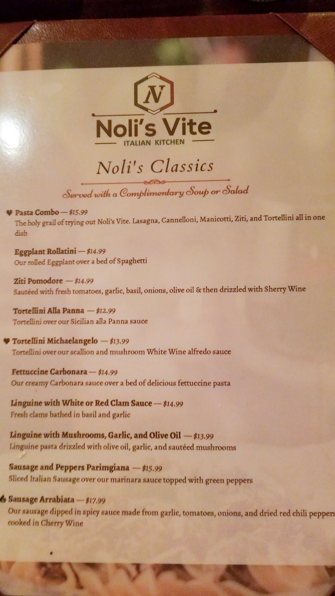 I would like to start off by saying I see a lot of five-star reviews here but my visit was anything but that Our experience at Noli's Vite had more plot twists than an M Night Shyamalan movie. We walked in the front door to find out that they were not taking names for tables, instead you would just wait in line until you reached the hostess booth where there was no hostess. Instead a waiter would "eventually" come along and seat you. We were in a group of four and there were two other groups of four and one group of seven ahead of us in line. Even though there were three empty tables in the interior dining room and two outside all the groups of four had to wait until they set a group of seven which took them approximately 30 min. I'm sure they had their reasons but I can't figure out why they just didn't push two of the empty four tops together to sit the Group of Seven immediately, and that was just the beginning. While waiting in line we watched one waiter walk around the dining area aimlessly carrying an appetizer dropping food off of it along the way which he continued to do during our entire dining experience over and over again. After they set the seven top it still took a good 10 min. for us to be seated which normally wouldn't be a big deal but there were empty tables. After we were finally seated and our waiter took our drink order he disappeared for roughly 20 min. before he took our food order. Our salads came out in a timely manner but were mediocre at best literally a tiny bowl chopped iceberg lettuce with one slice of tomato on top, and I don't know for a fact but I believe the dressing for the salad was bottled as it had that bitter aftertaste that bottled dressings have. After that an hour passes before our food shows up which was delivered one plate at a time as if the waiter couldn't handle at least two. But just then when we thought all hope was lost we were hit with a major plot twist, the food was actually delicious and with the exception of my wife's plate all of the portions exceeded expectation which surprised the heck out of us after witnessing all that we had up to this point. Of course after our food was delivered things went back downhill from there our waiter rarely visited our table as he and the rest of the staff were or at least appeared to be in a very confused state that can be best described as running around like a chicken with her head cut off. I mean these guys were all over the place. It was very obvious that the owner and staff of Noli's Vite have little to no experience in the industry. Just to give you a further glimpse down the rabbit hole at the end of our meal our plates were empty but our waiter came to the table and asked us if we needed any to go boxes LOL there was no food left to put in the to go boxes, he then asks if her ready for the bill which we were, he stood there in a confused state as I stared back at him waiting for him to hand us the bill eventually he says he'll take our card to the register I asked him what the total was as a wanted to know before I handed him our card at which point he states he could not tell us. I literally had to tell him that I was not going to give him my card until I had the total which he had to run off and calculate. Most restaurants come to your table with a statement/receipt that you sign he comes back with the original order ticket that he has now added the prices to. This story could go on but this is a review not a book so will leave it with a quick summary. The staff is not horrible just inexperienced and the food was actually quite delicious. Would I recommend this restaurant I think so as I'm sure with time they will settle in and get a handle on things. Keep in mind at the time of my dining at Noli's Vite had only been open for a short time. With that said they should have hired experienced staff at least for their...