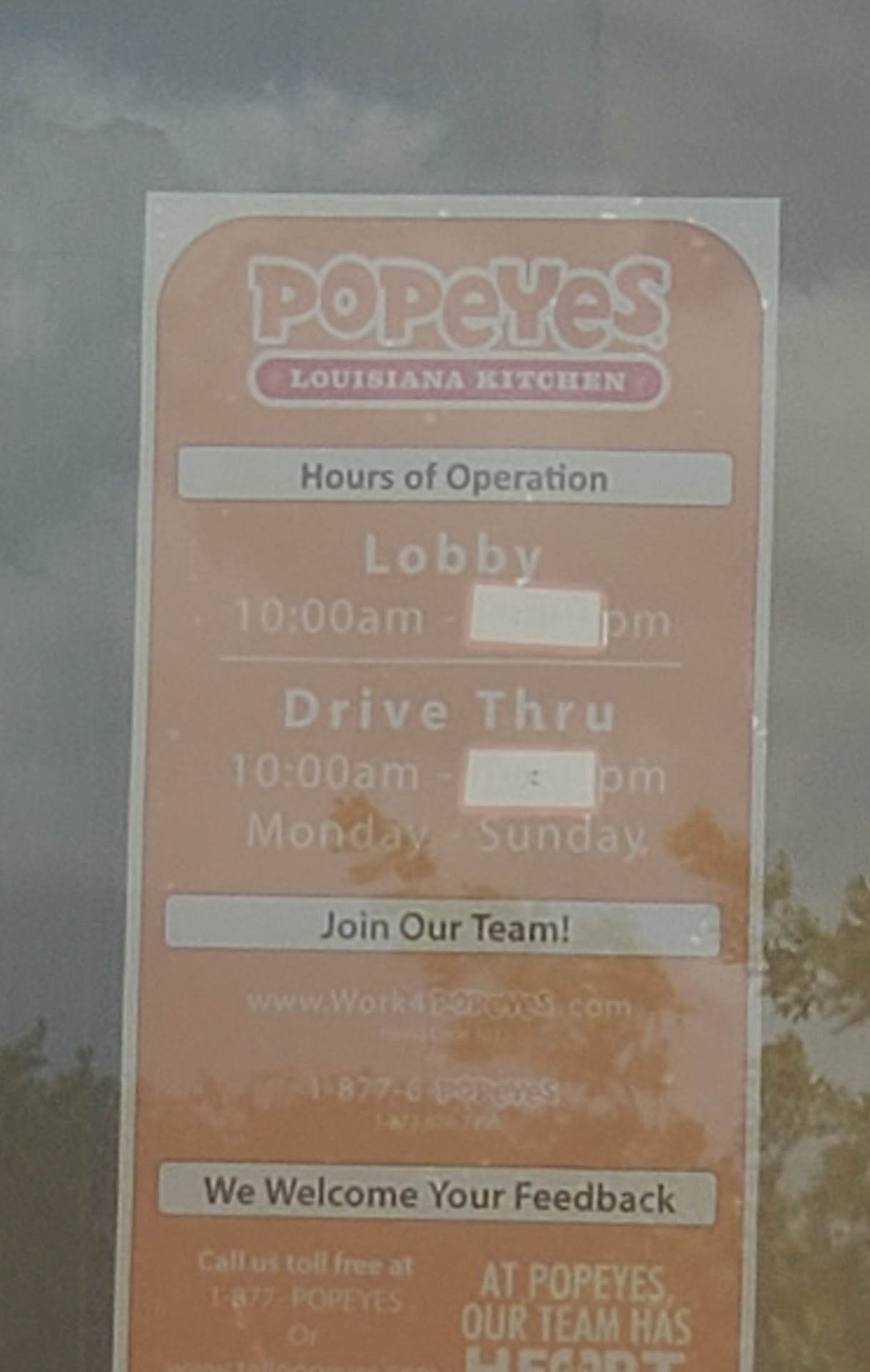 Read moreI’ll start by saying, that I am a big fan of Popeyes. The food is good and it’s convenient for me to go by after work. Sometimes they’re slow, but it’s ok. I even understand orders getting messed up occasionally, but that hasn’t happened much there. Last week I went through the drive thru and ordered 12 ghost pepper wings. I paid, got the box, and headed home. I got home opened the box and had 6 wings. Like I said, mistakes happen. I’ll just call and I’m sure they’ll get this resolved in some way. Boy was I WRONG! I called and the phone rang and rang. I hung up waited a few minutes and called again. Same thing no answer. I decided that I’d just go to their website and see if I could email someone so they could get back to me. Coupe of days passed and I realized that no one has ever gotten back to me, so I sent another message. At this point I will say that I’m a little upset, not about the wings, but the fact that I can’t get anyone to talk with me. Finally after the 3rd email, I get a response. It asked me to describe the issue, even though I had already put that in the 3 previous emails. It has now been 1day shot of a full week and I’m still trying to get this resolved. This whole experience makes me feel that I’m not valued as a customer. I can’t contact the store and the customer service does not make resolving customer issues in a timely manner. Most likely, I will not be returning to this or any...