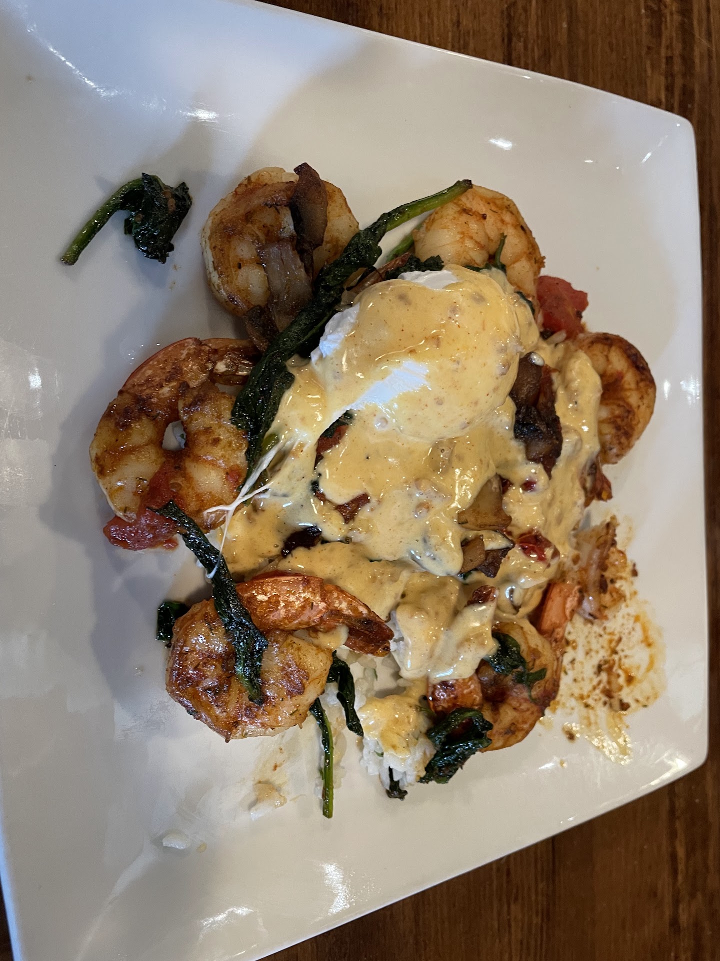 Read moreThis is not the first time I have eaten here. I figured pop in for Brunch. The place was bussing with customers. We sat at the front, waiting to be seated for a few minutes. I commented, "Wow, you can tell they are understaffed." They sat us next to a larger table that was full. I had to pull the table out a little because it blocked the other table from getting out. The service was slow, but understandable without busy they were. I had ordered the special, which was this chicken sandwich with diced tomatoes and fries. We also ordered this Shrimp Egg Benedict. The sandwich was just ok. It was a grilled chicken patty that was covered in diced tomatoes. I am really not sure what they were trying to go with this sandwich. The fries were lukewarm. I am not a fan of Eggs Benedict, but the Hollandaise had a good favor to it. It as mixed with Chrorizo and had like a queso flavor to it. The shrimp were large. They were dusted with some sort of Cajun seasoning that was a tad bit salty. The waitress did come by to refill our drinks and hear us commenting that it was a tad bit salty. She did ask if we wanted something else. She ended discounting the plate because of the issue, which she did not have to do.