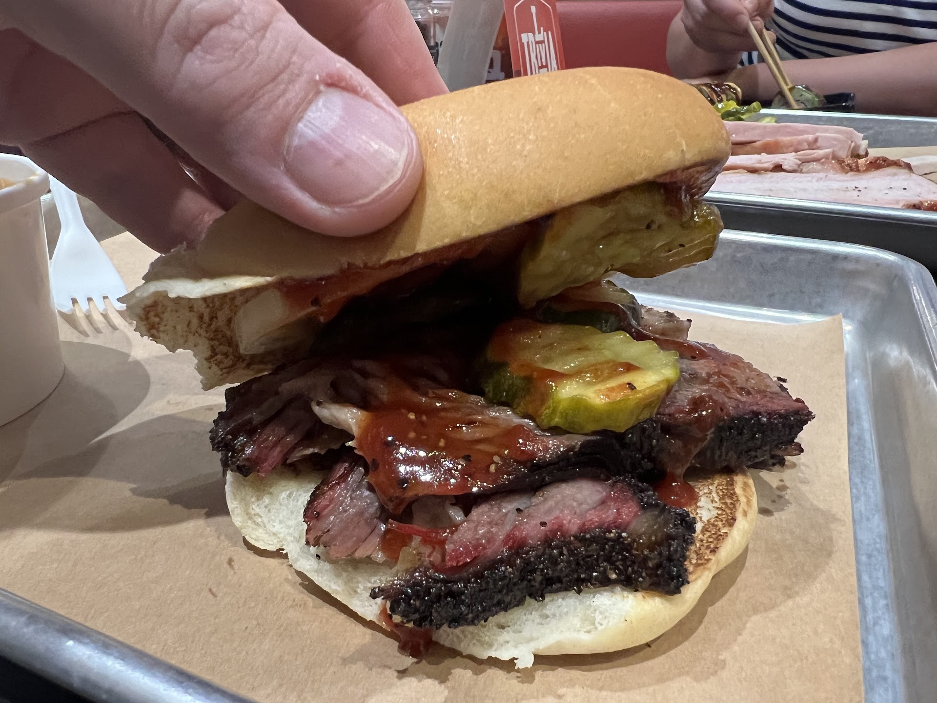 Read moreFirst time trying this BBQ. Menu looked great but unfortunately, the food was disappointing. Ordered two meat plate, brisket (fatty) and sausage. Brisket was dry and tough, sausage was really a complete let down... very tough casing (not edible). Brisket Beans were mostly liquid and not very flavorful. Brisket nachos were okay but average at best. They were out of cherry cobbler so no desert! Two choices of BBQ sauce, both were good. There is a lot of potential (giving this location a 3 instead of a 2 because it is so new) for True Texas BBQ and I would really like to see this location improve, but changes are needed! One cashier... one restroom, so be prepared to wait in line for both. Bill Miller's has been very disappointing lately and I was hoping for a new breath of fresh air with this location, but with competitors nearby such as Black's, Rudy's, etc... it...