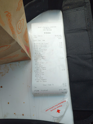 Read moreNot very happy with our 23 minute fast food experience today. We ordered and paid for our food. We were given our frostys right away and asked to pull up behind the already waiting car ahead of us. We sat and waited , we sat and waited, and then some more, until we saw the car behind us receive their food before we got ours. At this point, I am going inside. I get to front counter and young man asks how he can help, and I state" the car behind us just got their food before us. We've been here for 20 minutes.... May I ask what's going on?" The manager has come up as I was addressing young man and he asked " you have the 3 biggie bags?" I said yes and informed him we had not received our drinks and calmly stated I couldn't understand why in 20 minutes we hadn't received our order. He states they were waiting on the nuggets and fries.. . Which I've never waited 20 minutes for the same ever in previous visits. I calm down enough to answer that we'd like honey mustard, barbeque sauce for nuggets as well as ketchup and salt please. Right as I get back in car, we are presented our 3 large drinks ( the biggie bags came with small normally, so we assume this was a gesture to show gratitude for us patiently waiting. About 2 minutes later, our food is delivered and low and behold.... We got barbecue sauce, and no honey mustard for nuggets, and no ketchup or salt to be found. And to top it all off, the three Dr. Peppers tasted awful.