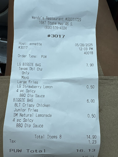 Read moreWent here twice two days apart just because it's down the road from my house. The food was good. I ordered 2 Dave's triple meat burger and fries for myself and boyfriend. Really good food. My son orders the baconator triple meat meal. He loves it. But our cashier was the same kid each time. He was rude and loud. You could tell that he really didn't care to be there. He demeanor towards his fellow employees was ugly. Telling her "that is for my drive thru only. I'm not going to be standing here stocking it up all day". His shift manager was standing right there and seem like she didn't care. She never once told him that his behavior was inappropriate. As another staff member was helping me. He kept interrupting her and trying to correct her as she was speaking to me. I was a Manager for years and I wanted to correct his behavior. Honestly I would of fired him along time ago. Not my place or restaurant but it seems like they allow this type of behavior or the shift managers allows him to run over them. It ruined my...