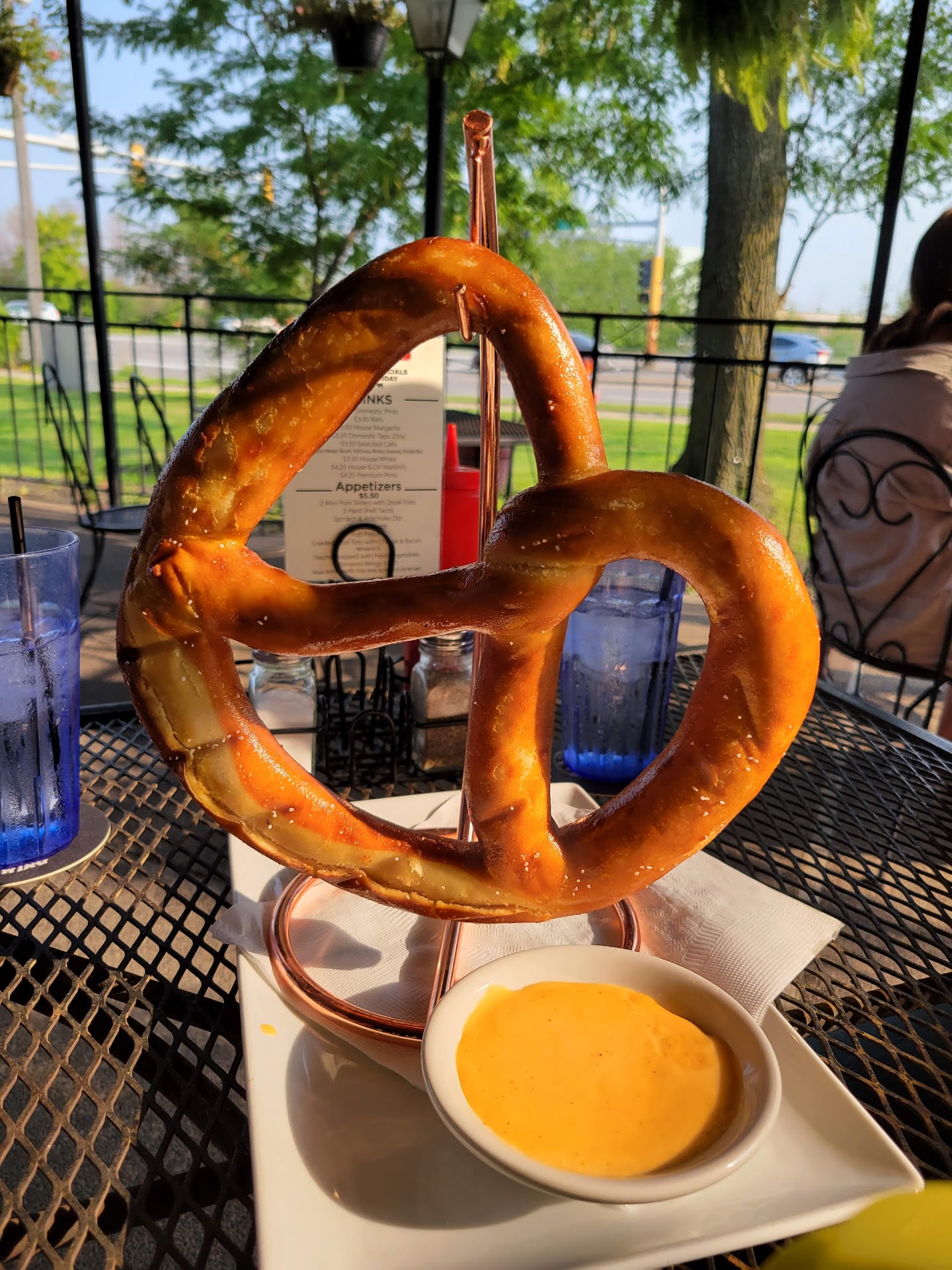 With that being said, it was a decent place to eat. We were there during their 'happy hour' and got discounted appetizers. We got the pub pretzel which was very buttery and delicious, hot from being made, and came on a really cool hanger. For our meal we all got burgers which were made to the specified doneness which is appreciated, not all places follow what is ordered in my experience. The staff was friendly but not really attentive, in between our waitress coming out to check on us was quite awhile, and different people brought out our food (both appetizers and entrées). Inside it didn't look too busy so they're probably just short staffed. It was OK though since we were having a relaxed meal anyway.
