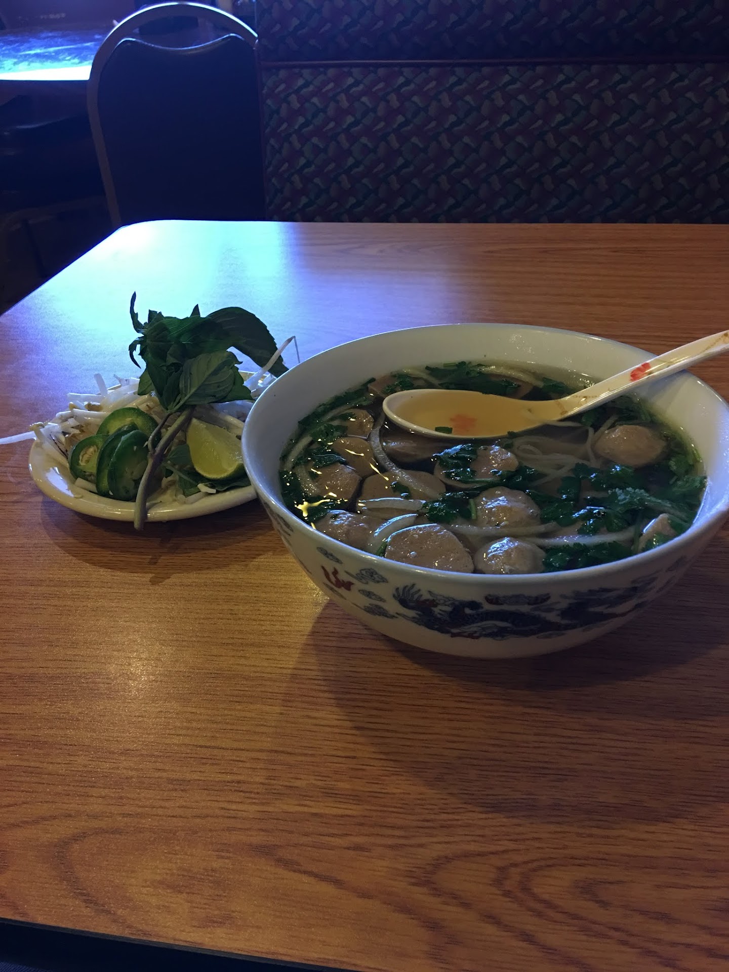 Read moreI was really excited about it when I drove past. We decided to come back the next day. It's in an unassuming building, that looks updated from the outside. The moment you walk in, the damp musty/moldy smell hits you. At this point I'm already contemplating turning around leaving. But I figure it has 5 stars.... we wait a few moments before the waitress comes out and seats us. There were only 7 tables with people. She's the only waitress. Running food, taking orders, answering the phone.... she's over worked is for sure. She finally comes out and tells to sit at a table. We sit down and wait.... and wait. I'm still thinking about leaving. I can't get over the musty smell of the place. She finally throws a couple of menus our way, while she's on the phone taking an order. I think again to myself, how the hell does this place have 5 stars?! We finally decide what we want and wait again. Finally she takes our order. The cream cheese wontons were pretty good. The egg rolls are different but good. They were coated in penko for extra texture, I guess? I ordered pho #20 and my husband pho #18. He enjoyed his. The meatballs were formed and had the texture of hotdogs. My flank steak was super fatty, to the point I ended up pulling it out and discarding it. What little bit, of meat I tasted, wasn't very good. Very bland and questionable. The broth and veggies were ok, but I just couldn't get over the musty smell of the place. We finished and I couldn't wait to get out of there. I told my husband I needed fresh air and got up and left. As I was leaving, there was a customer unhappy with what she ordered as well. It seemed they don't take substitutions to dishes. I felt nauseous all the way home. So far, neither of us got sick. Most definitely will NOT...