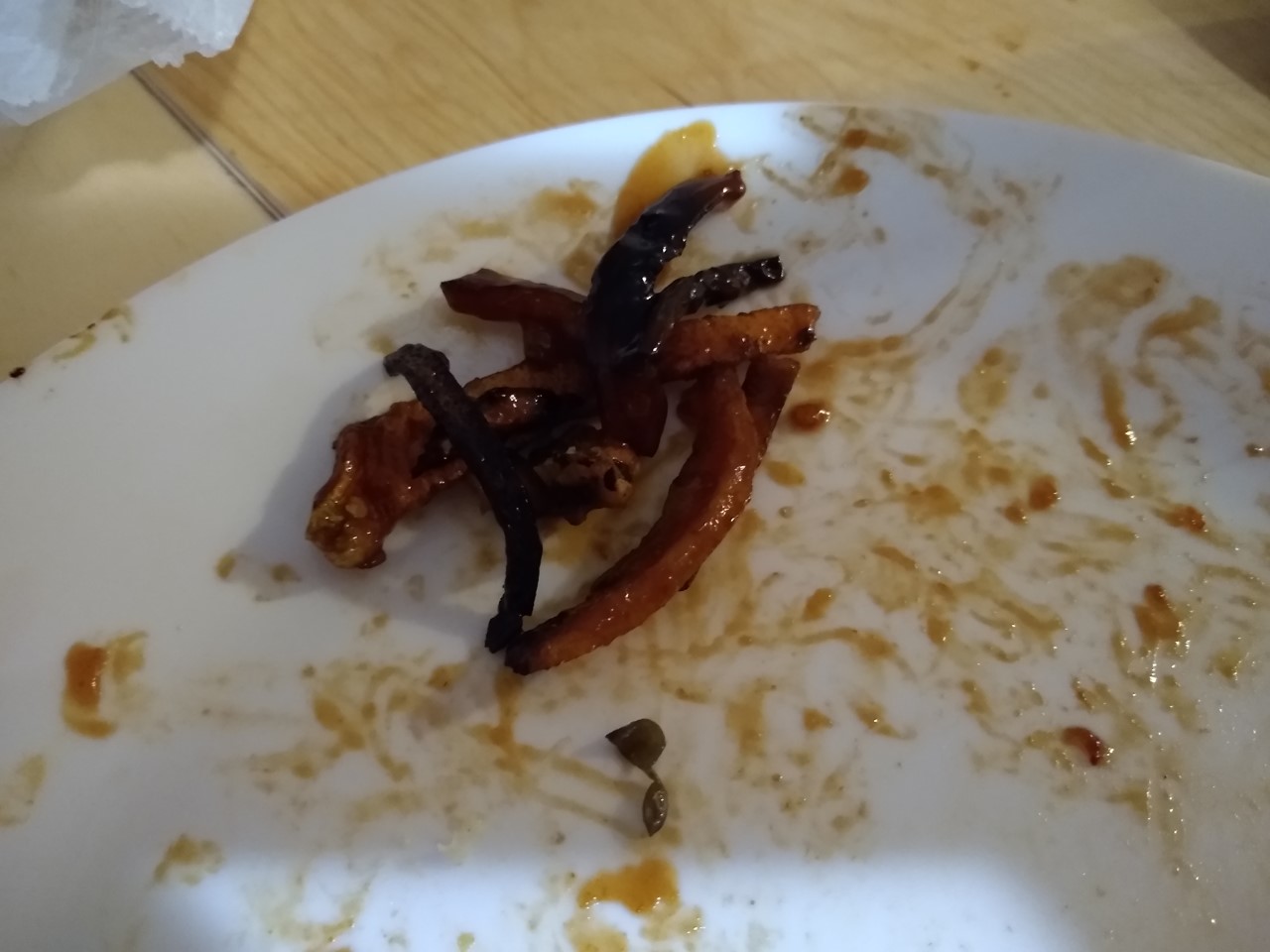 Also ... Pictured Below... Why are there strips of charred, burnt orange peels in the Gen Tso. chicken? I understand that the oranges are part of the flavor, but why are the orange peels burnt? And why are they including the in container and not removed before shipping it out? They aren't edible, and its hard to differentiate them from say, a carrot slice or something... until you put one in your mouth that is.... So...