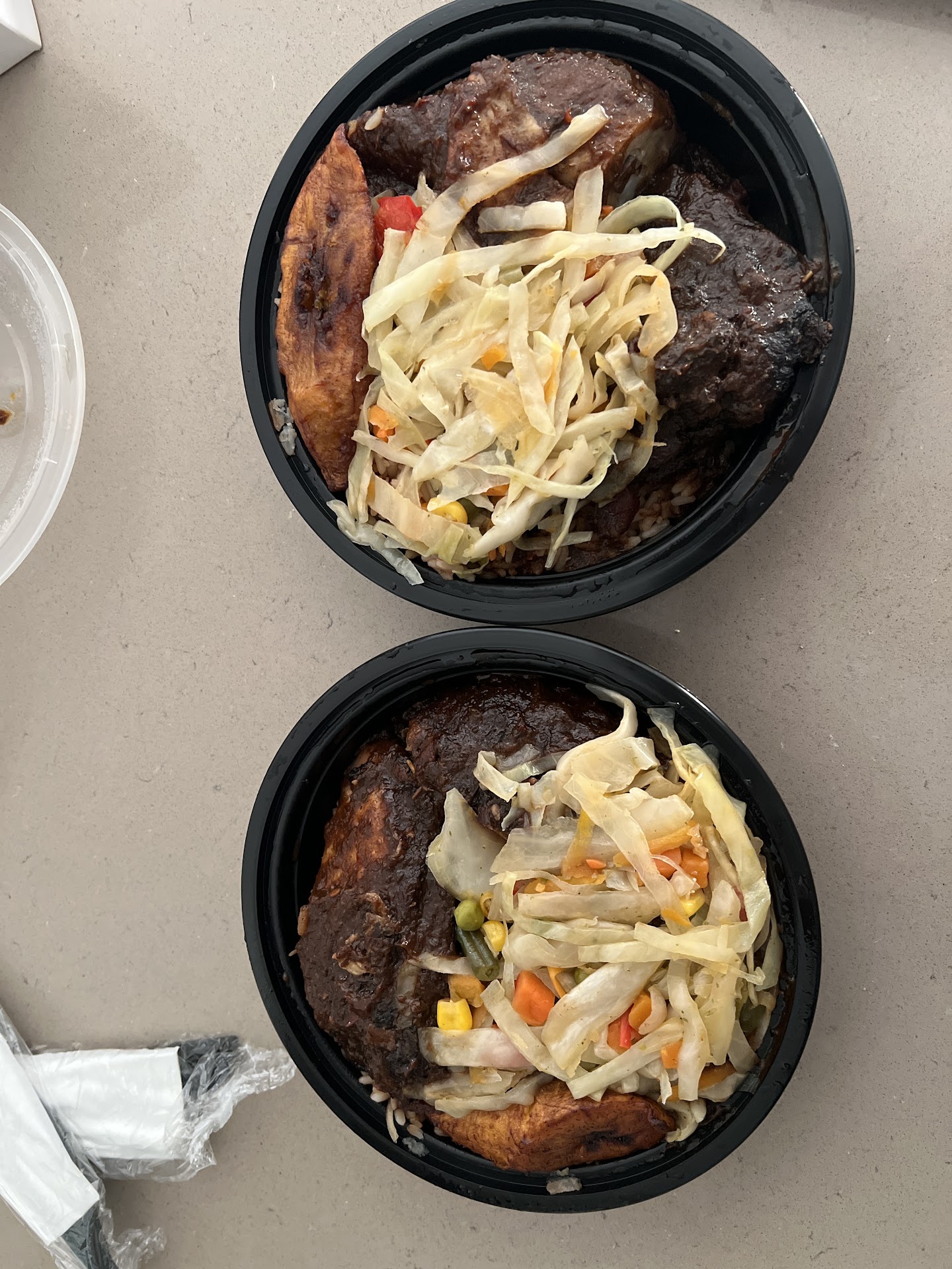 They also messed up my order. I ordered a large jerk chicken with no rice and a small jerk chicken with rice. And they put rice in the large and no rice in the small. The next bad thing ... while placing my order on the phone I asked if I could get a side order of plantains. She said they didn't do this as a side order but that it would be included in the meal. So between the 2 jerk chicken meals, there was ONE SLICE of plantain! What the hell?! The plantains are my favorite part of this meal which is why I wanted more on the side and they give me one lousy slice?! Where was the rest of the plantain?!?!