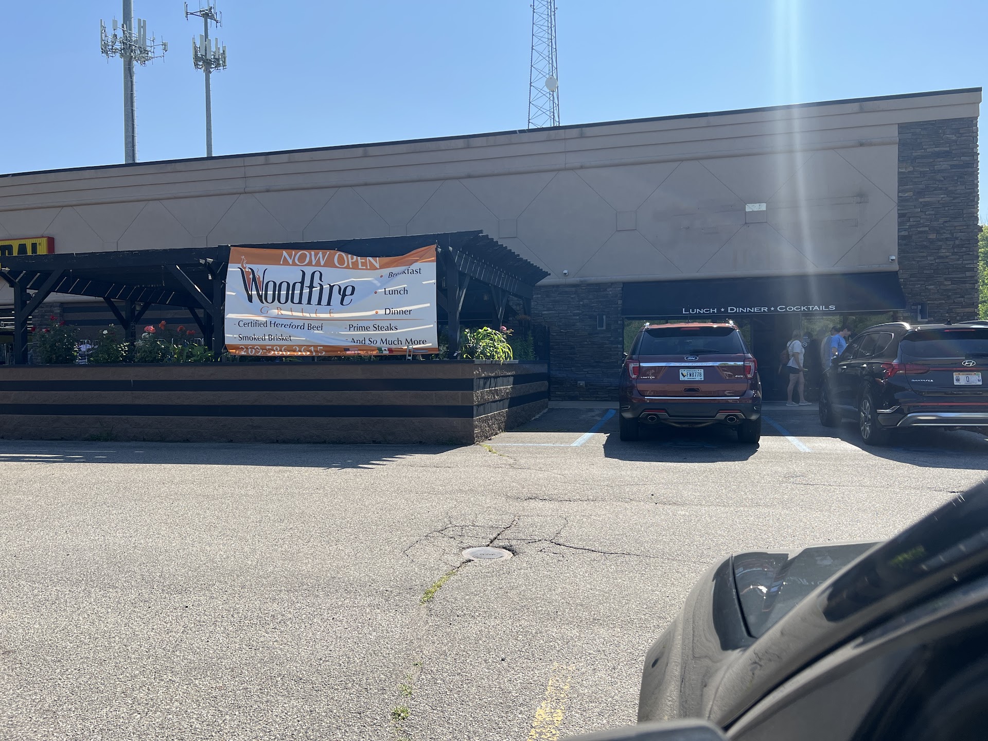 I ordered a diet soda and the Flaming Saganaki Cheese for a starter. I wanted a cocktail, but apparently they weren’t serving those. We ordered two dinners to nibble off of and experiment with. We got the Woodfire Burger and the Steak Woodfire Quesadilla. The burger was 1/2lb and I chose medium for the temperature. It was topped with Pork Belly and it was also supposed to be topped with Queso Fresco, but apparently they didn’t have that, either. Wow, this was beginning to be very unprofessional. They topped it with mozzarella cheese instead. It included Homemade Fries. The quesadilla had green and red peppers, onions, and cheese.