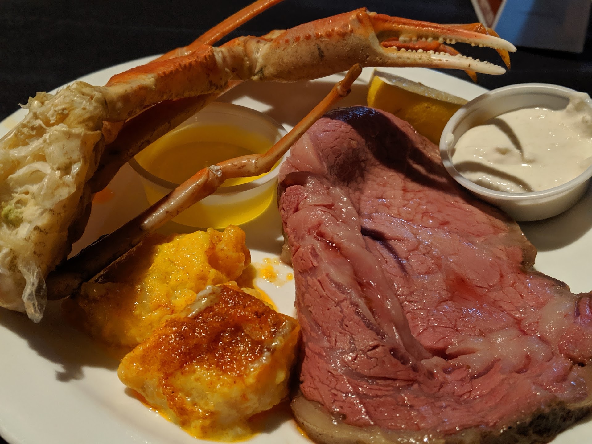 Food was good -- but very pricey. We each got the Surf N Turf at $40 ea. This was certainly not the most expensive item on the menu. But, it gives you an idea. ( You can spend $80 on an entree.) Soup or salad included, plus one side (mashed potatoes, baked potato, etc.) . One of us got steak, one got prime rib. The steak was ordered well-done, and the prime rib was ordered as Medium. The steak was medium (had too much red). The prime rib was rare. I sent it back to get it cooked more thoroughly. It came back a little better -- but still rare. I didn't bother to send it back again.