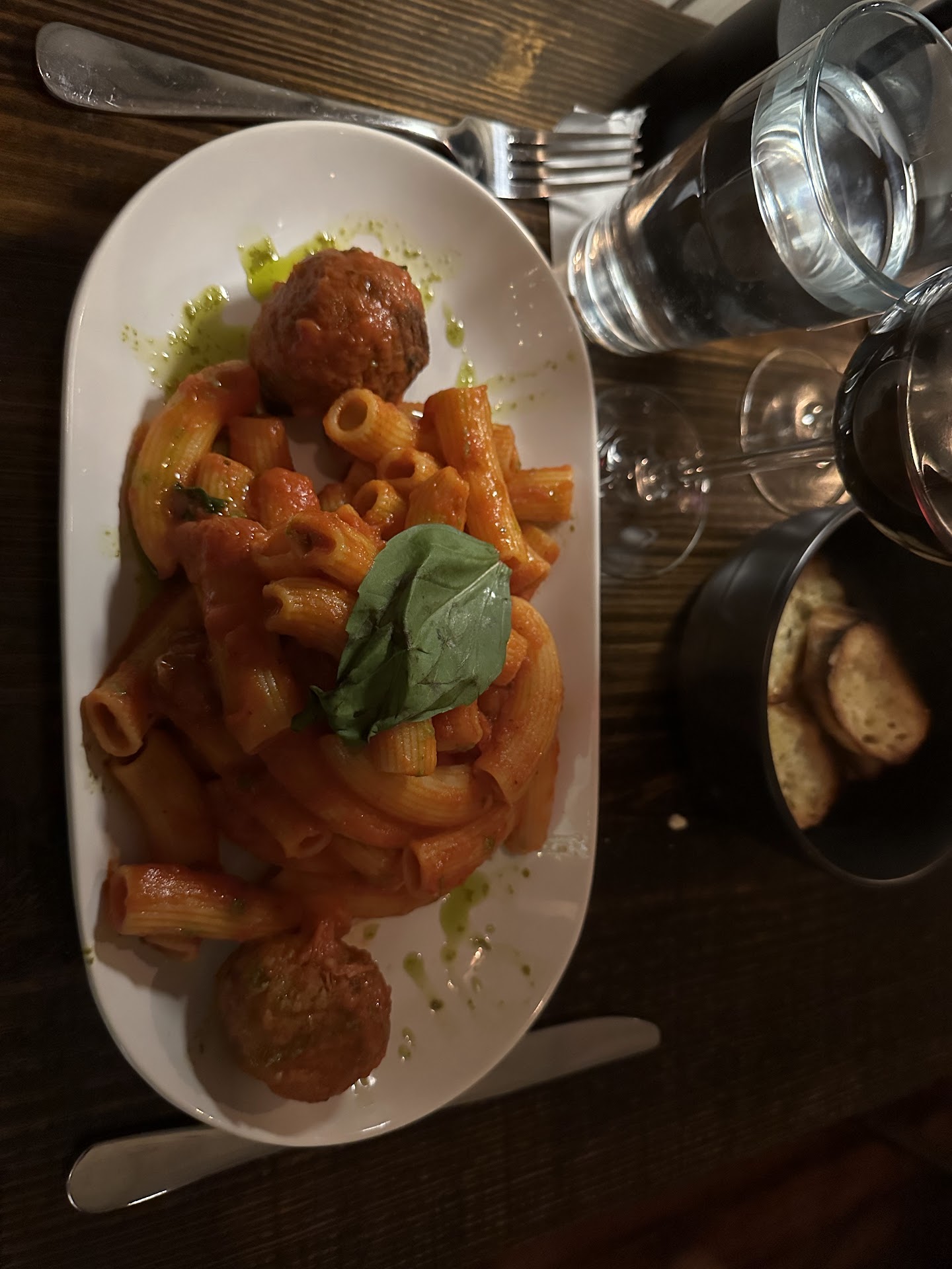 I opted for the homemade rigatoni with Pomodoro sauce, adding meatballs to my dish. The rigatoni was perfectly al dente and the Pomodoro sauce bursting with the fresh flavors of sun-ripened tomatoes, basil, and a hint of garlic.