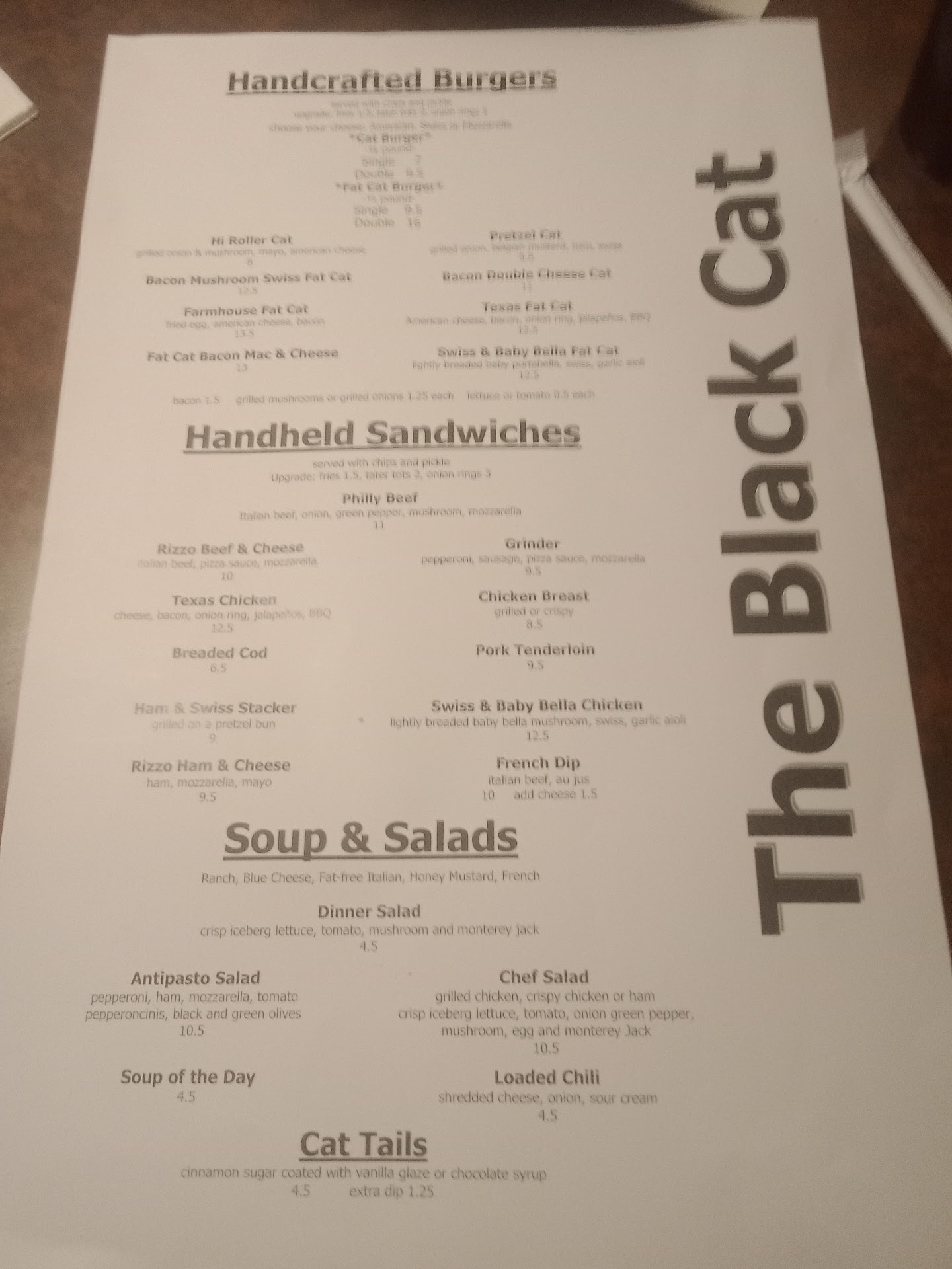 We go to black cat quite often. Normally it's okay. But we always end up with our food not being right or waiting the longest time for drink refills. Even though the place is very small so they can obviously see you need a refill. We just ordered carry out yesterday for the last time. My husband tried ordering wings but the woman was getting so confused on the phone. Then she said you could only order an odd number. My husband wanted 8 wings BBQ and the other garlic. She didn't understand what he was saying. I wanted a hamburger basket with fries. And she couldn't understand that I wanted my hamburger with things on it like pickles and ketchup and what not. We received almost an hour later, 25 chicken legs, not wings, and all of them were burned. I also received a hamburger basket with 15 fries in it and a bun and a piece of meat. Nothing else. My husband paid quite a bit for this meal and this was what we got? Needless to say we will NEVER go back to black cat again because of the wait staff...