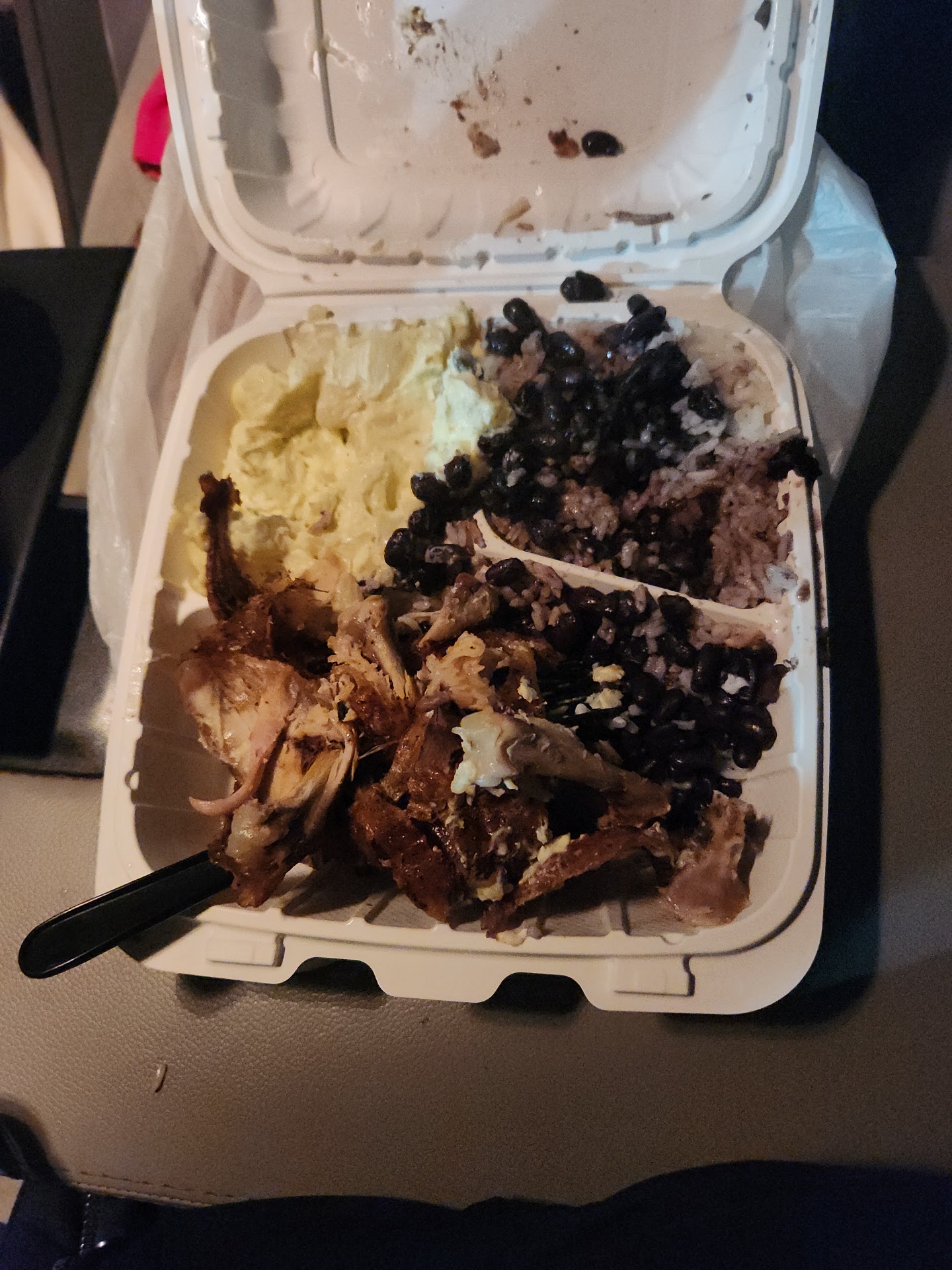 So I came into the restaurant around 8:42 pm. From the outside I couldn't tell if it was open or not. I get inside the place is completely empty. The decor is all black. I order a quarter chicken, potatoe salad and beans with rice. The chicken came out completely dry. I taste no favor. The skin on the chicken was hard as rubber. The sides were plain and no real flavor. I'm not coming back here again. Not worth $13.99
