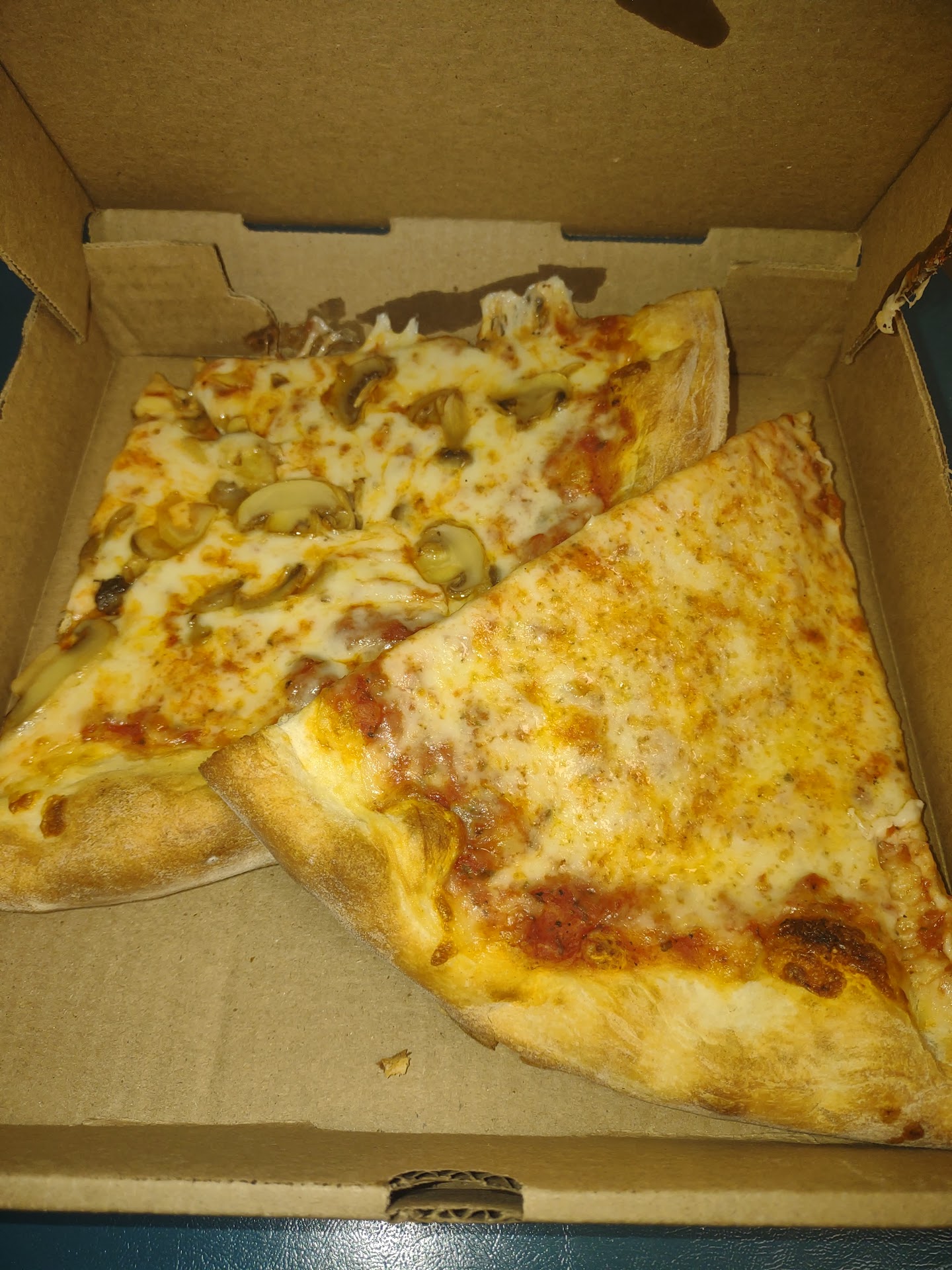 The pizza was great, just the right amount of crisp, the perfect amount of sauce, and the cheese was on point, both the cheese and mushroom slices had zero flop, and the toppings didn't slide off when I took a bite, exactly the way you want a slice to be.