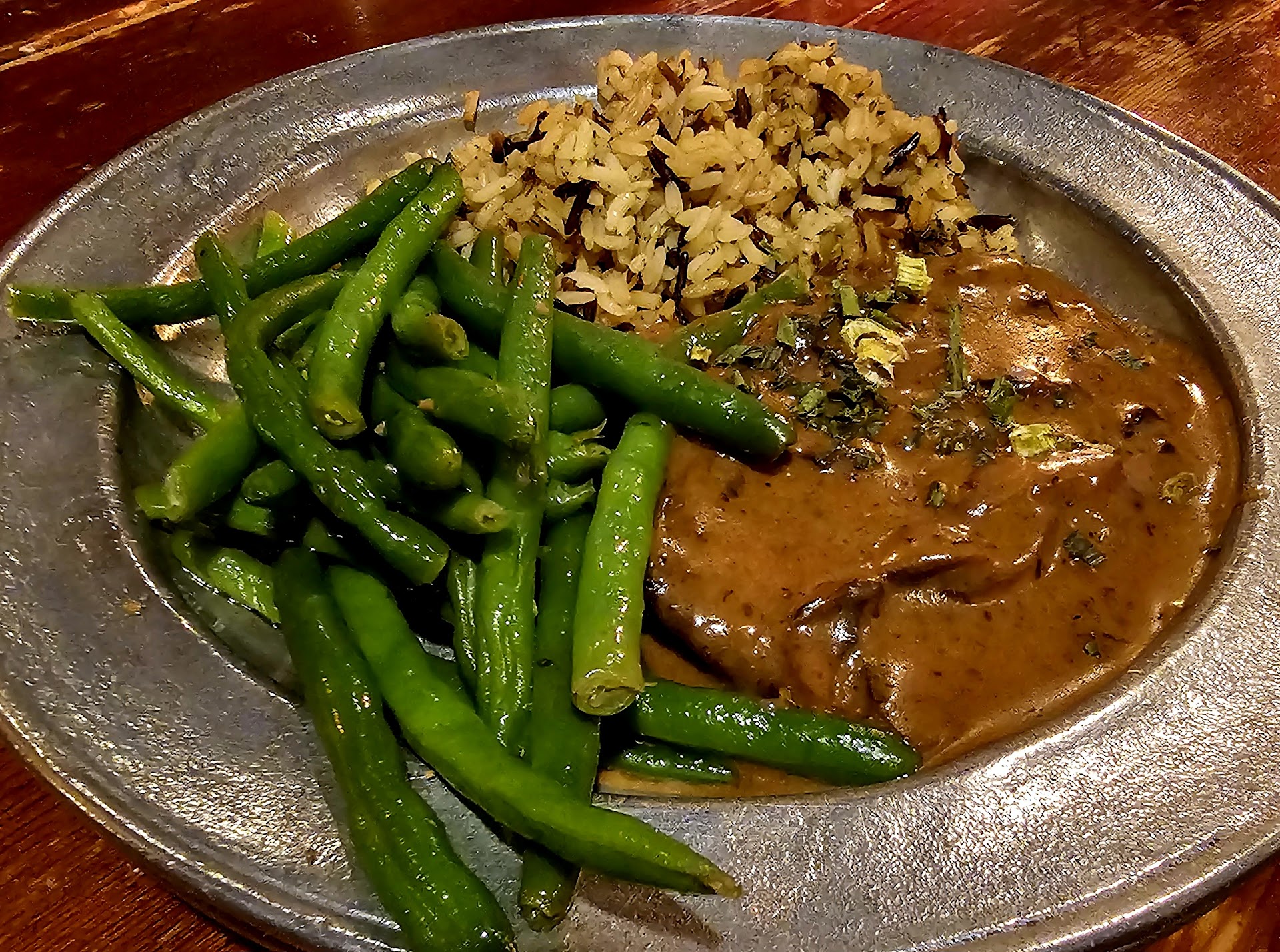 My wife got the Fricken Chicassee which was fun to say and even more fun to steal bites of. It came with fresh cooked green beans and wild rice. Usually things like this aren't something to get at a restaurant and I was pleasantly surprised with them both. The chicken was moist and savory. I'm not a fan of mushrooms, but I could have licked the plate clean. Each bite was filled with an almost overwhelming experience. The sauce was well developed and had such a depth of flavor that it really stole the show.