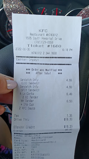 Read moreMy receipt says Crystyn, so anyway the lady tried to charge me $28.52 for 2 legs 2 spicy tenders and 2 sandwiches. 1 spicy 1 original. No sides or drinks. Then when I got to the window I asked why so much, and she said $7 plus tax for the 2 legs alone. $10 plus tax for the sandwiches and $8 plus tax for the 2 piece spicy tenders. You're supposed to get one sauce free and she had already given me my receipt before I asked for a sauce and had already charged me for this sauce before she even knew if I wanted any. Told me getting it spicy is an upcharge. And then when I got my spicy tenders the container was filled with their grease and all of the crud that goes on the bottom of the fryer. The tenders were covered in that black stuff from the bottom of the grease pan. I asked for new ones she was said she would have to charge me twice. I asked for a ranch and a KFC sauce she gave me a barbecue and a honey mustard. By the way I told her to take the $7 chicken legs off because that's ridiculous $3.50 a piece. When they're going to pick out the smallest one that gives you two whole bites. This brought my bill down $10 taking...