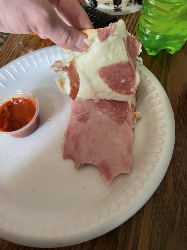 The pizza is awesome. Crust isn't too greasy and not too dry. Toppings are pretty fresh except for the mushrooms. Would rather have fresh mushrooms. The price is about average. They have coupons on the back of your receipt if you shop at Giant. You can get a large Cheese for $7.99.