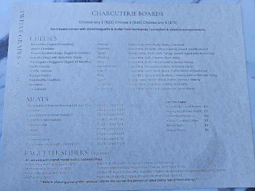 Read moreThis is a wine bar with food limited to a bevy of charcuterie board choices. They have a liquor license so you won't have to miss out on a GENUINE Margherita, made from real lime juice (not a mix) and is a very refreshing change from what every other restaurant in our area is doing . Four of us had a couple drinks each, covering the whole spectrum of beer, wine, and liquor. Everything including the service was very good . A cozy, beautifully decorated space is perfect for a pre-dinner rendezvous or a first date. Even the non-gender specific restroom is decorated in a very bold, coloful manner. The owners were tending bar the evening we went, and were very chatty and fun to interact with. We'll...