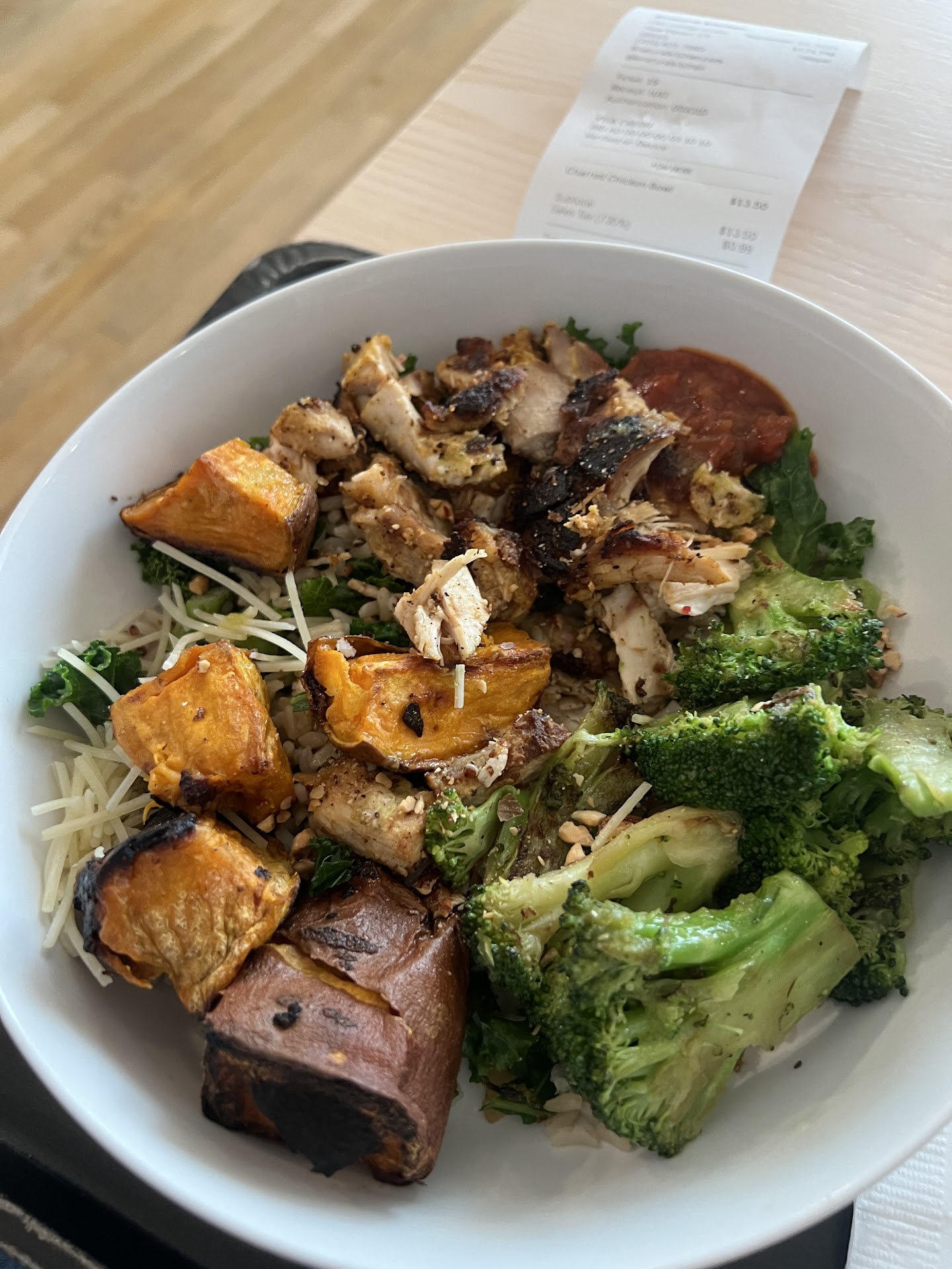 Read moreWow. This place used to be very good, but I just had one of the most disgusting bowls I’ve ever had in my life. I would avoid them like the plague in their current state. Asked for a charred chicken bowl and with no beets. For some reason I was brought a bowl with no chicken, and beets. They brought out a bowl with chicken and I kind of wish they hadn’t. It was completely, and I mean completely dried out like old shoe leather that had turned to sawdust or some kind of chicken jerky. I couldn’t even finish it. The rice was also cold and dry. The broccoli was cold. The only ok part was the sweet potatoes. And overall there was hardly any food there.