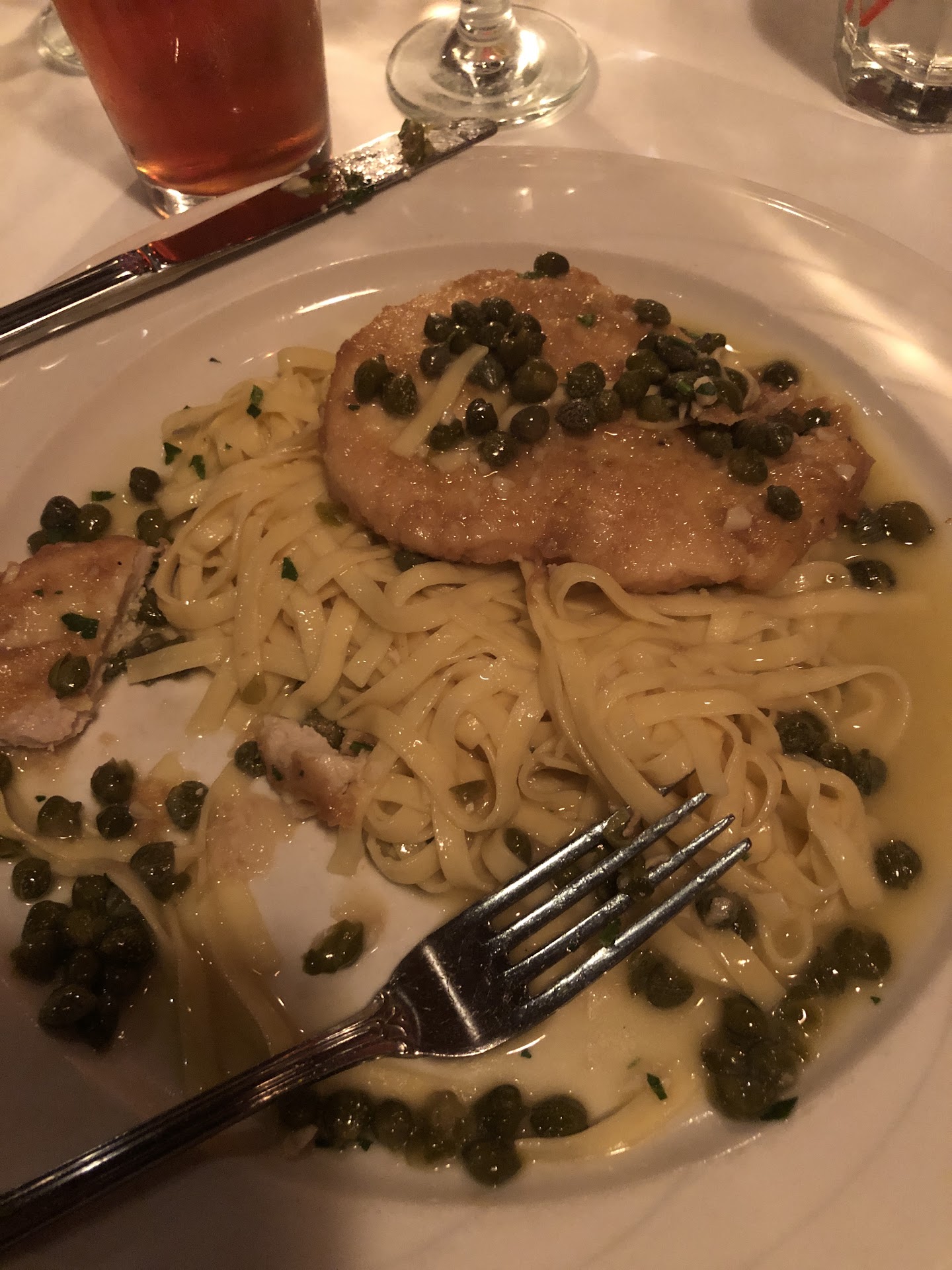 Onto the entrees: My partner ordered the Lobster Ravioli and Jumbo Shrimp. The raviolis are simmered in a plum tomato cream sauce, which was given generously. He enjoyed this dish, and expressed that the lobster and shrimp were fresh and that everything was of great quality. I ordered the Chicken Rosa, which is simmered in the same sauce, but comes with linguini, 2 chicken cutlets with mozzarella cheese melted on top, and fresh tomato slices. This dish also comes with eggplant, but I asked for it without. I made the right choice, because the amount of meat they give is generous. Not too much, but more than fair. The chicken was tender, outside fried perfectly. The sauce was well-seasoned, the pasta was cooked to my liking, and the entirety of the dish left me pleasantly satisfied.