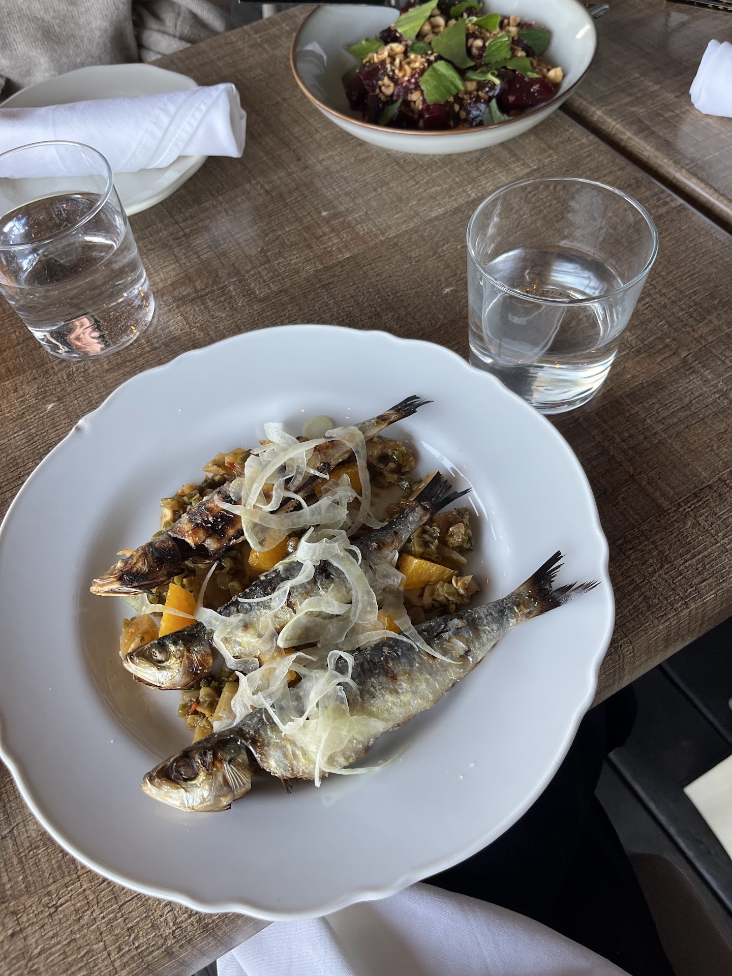 Now on to the negatives. There is some fundamental disagreement between this restaurant group's palate and mine. The dishes as a rule are overwhelming flavor forward. Sometimes this works well as in the case of the beets that were well seasoned and creatively dressed with a soy-based finish. Most of the times, this leads to just too much of a palate party that a) destroys any natural flavor in the item (branzini, squash, duck), and b) almost numbs your tongue to any further stimulation thereafter. In the worst case scenarios (the maple chess pie), it leads to something that is simply inedible and tastes like it was baked with the wrong size measuring cup of salt.