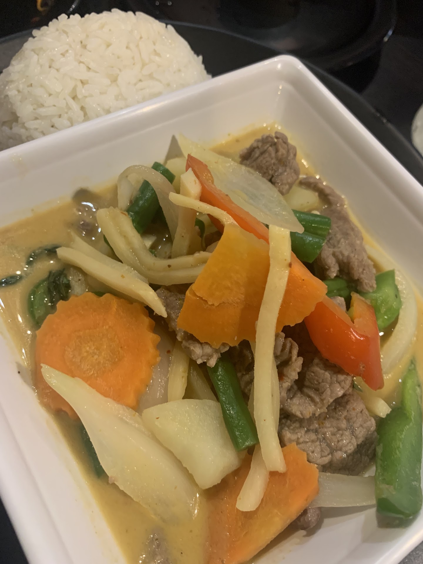 Letās move on to the mains. My friend and I both got the curries. I got a āspecial House curryā. I appreciate the amount of vegetables they had on the dish, and it was cooked thoroughly. The curry itself, however, was a tragedy beyond belief. It was watery, lacking in flavor and spices, and was just not an enjoyable meal to eat. Thai curries are typically rich, decadent, and a bit creamy, and this dish did not properly represent those profiles.