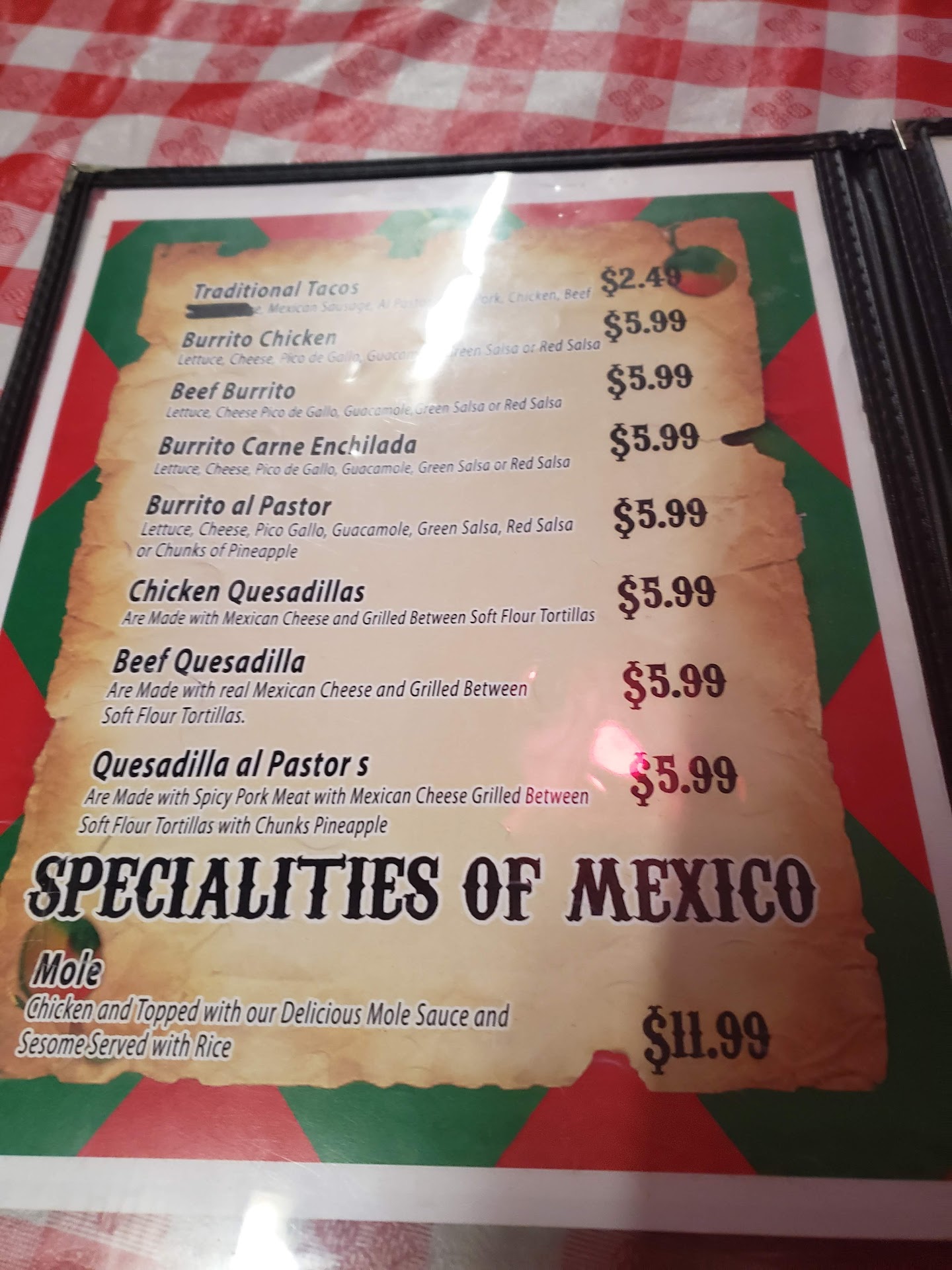The place is a bit dimly lit, a bit on the small side but on par with most Mexican restaurants I've been to. The red and white vinyl table cloth is a bit tacky but again something I'm used to seeing at Mexican spots. The menu is also a bit sparse but not something unexpected either.