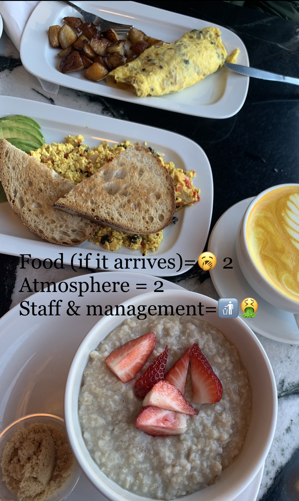 Here’s what happened: Me and my husband order our food (waffle, omelette, tofu, scramble, oatmeal, and two lattes), the cashier says there’s an up charge for customizing/adding (I assume its the fruit and nondairy milk). We say that’s fine and find a table. Our order starts arriving but after a few minutes of waiting we ask a staff person to check if the waffle we ordered was coming. This person doesn’t come back and at this point we’re almost done eating. My husband goes up to the register to ask about the waffle. The plates have been cleared from the table and we’re slowly, sipping our lattes waiting for this waffle and still no waffle. When the waffle finally arrives, the person that brings it over says something about ordering 2, and my husband responds with “I guess”. The cashier comes over with a receipt and starts saying we got 2 waffles but only ordered one and we need to pay for it because the person that brought it over asked us if we ordered and that we said yes. We tell her we didn’t really know what he said when he came over, but we’ll pay. Then she continues to emphasize we only ordered one and we have to pay for the other one. And then she just stands there as if we’re not allowed to continue our conversation until we pay for this waffle. So I say we’ll pay when we’re done. When we go up to the register to pay, I tell her to let her manager know that their lack of communication and organization should not affect customers. And then she repeats “he asked you if you order two waffles and you said yes.” I reminded her we had to ask about our order multiple times. The manager/owner comes over and says did you enjoy your meal? 🥴 no, I didn’t enjoy being harassed by the staff while I’m eating being accused of lying and attempting to steal after having to wait so long for the food to arrive. Also, they ask for a tip when you pay for your order. This is why tips come at the end of the service not before you even sit down.