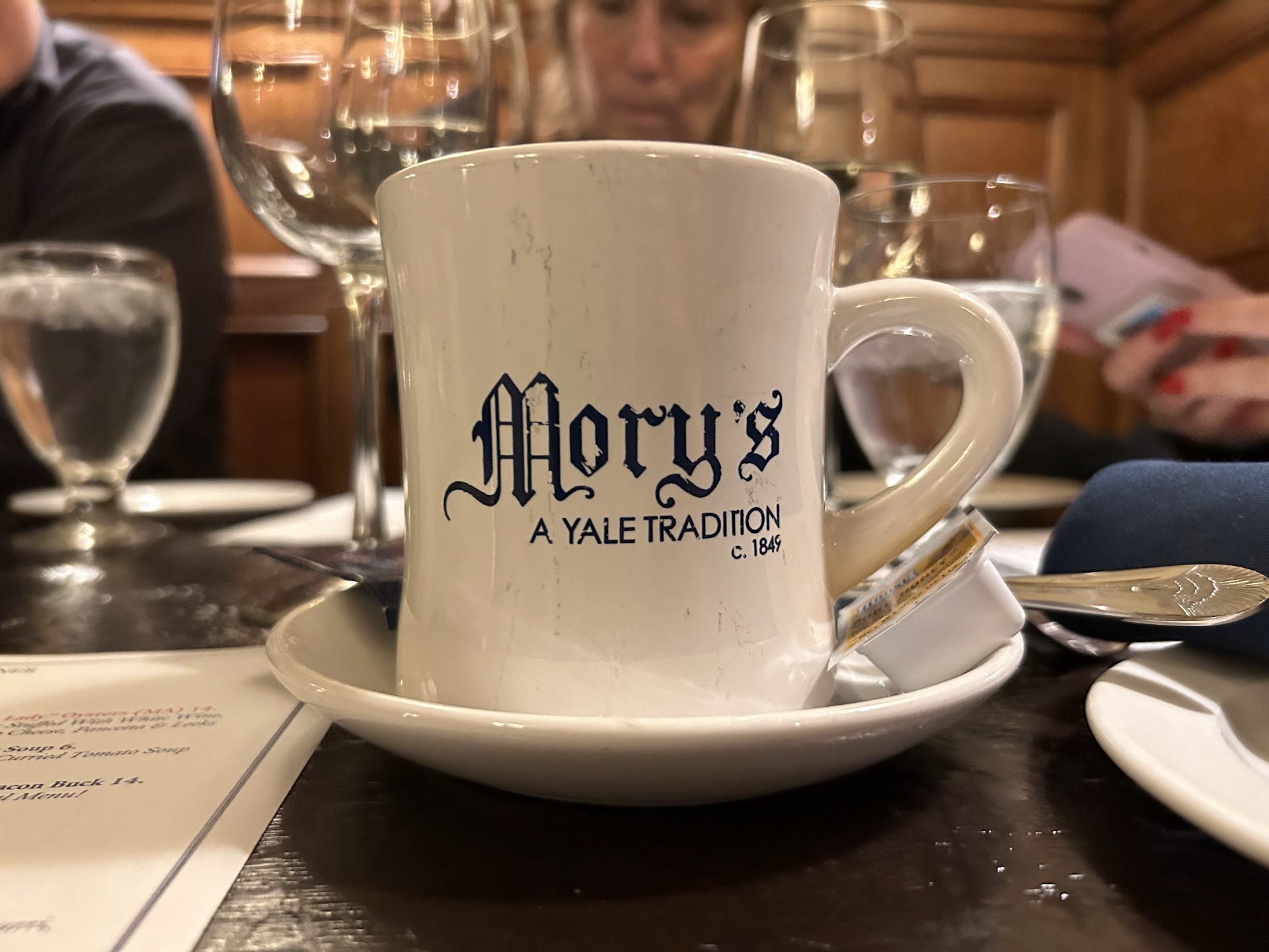 Read moreWalking through the front door of Mory's restaurant in New Haven, CT, and being greeted by not only the hostess and several happily exiting guest, but also the smell, sounds, and sights of the lively atmosphere was just terrific. After being promptly shown to our seats, due to called ahead reservations, further eye candy was displayed by the decor of room and longstanding photos from the 1800’s. Even the table itself was enjoyable to examine with student carvings that have stood the test of time and have since been lacquered over to be preserved. The waiter was more than prompt with drinks and taking our orders, making sure to point out the items that would be gone soon due to the season for lobster ending and also note the other items that were local such as the locally caught cod. There was no doubt in the quality of the food as my lobster risotto was incredible and my colleague’s grilled chicken was beyond satisfying, so much so, that deserts could not be fit as well. The wait staff did an amazing job working together to keep all drinks refilled, items hot and served right away, and items cleared as appropriate so that the meal just felt easy. They also were able to entertain us with stories of old student traditions within the restaurant including acapella nights and “cups” along with historical facts that prompted further intrigue. Without question, I’ll be coming again and would recommend it to all friends and...