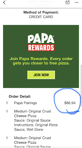 So, after 2 round trips to Papa John’s, I have 0 edible pizzas, and none of my money back. All in all, a solid 0/10 customer...