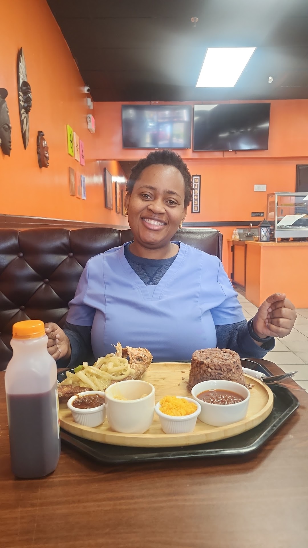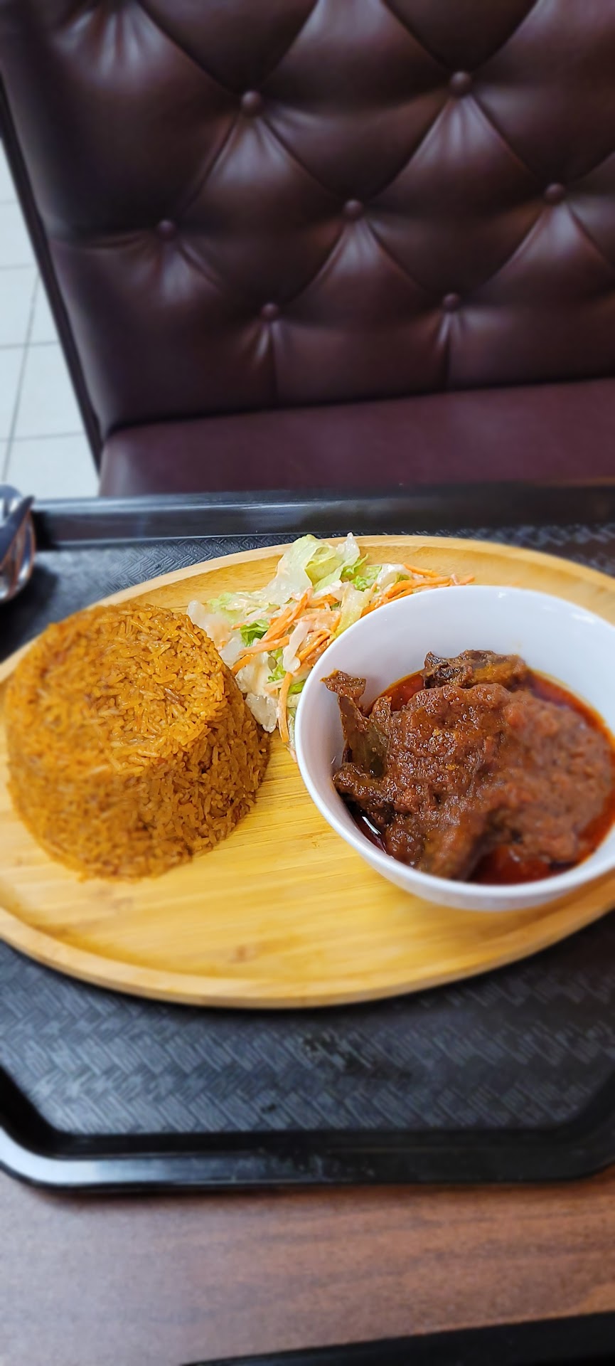 To be fair, I only ordered one entree, to-go. It was the Banku and Okra Meat Stew. The stew was full of flavor. Being an okra dish it was very slimy. The okra was cooked down to where it was almost indistinguishable. The rib meat was tough and mostly inedible. It was possibly goat meat. There was very little edible meat and it was not very tender. Mostly, it was bone and gristle. The biggest issue I had with it was the small shards of bone that were in the stew. The pieces of rib were mostly about two inches long, but they were sawn in an indiscriminate fashion so that there were slivers and bits of bone in the stew. I crunched into one of them. I was very careful eating it after that! I did not care for the bland, doughy Banku. It is not spongy or flavorful like Injera. I'm not going to give up on this new restaurant! I intend to try different dishes in the future. I'm sure that there are other dishes I will like. I'm sure I will like other African flavors based on the stew I had. I used to eat at Cafe Adulis in downtown New Haven and really liked their Eritrean and Ethiopian food. I see wooden plates in pictures....