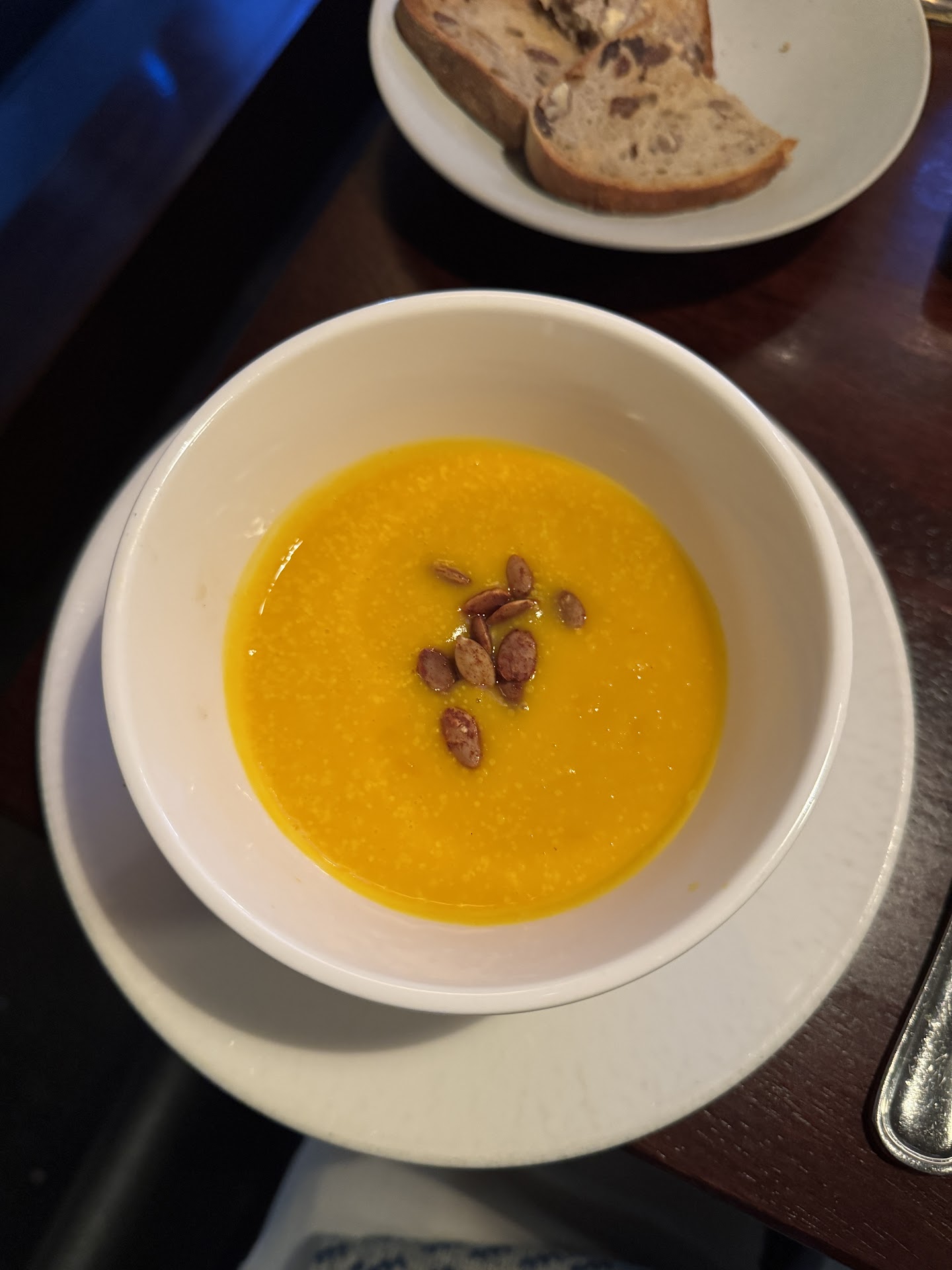 For the first course, I chose the butternut squash soup. It had an interesting tartness to it that I was not expecting but it went well with the overall texture and flavor of the soup. My only note on the soup was that it wasn't a smooth puree. Perhaps it was intentional, but I was getting pea-sized chunks of squash that settled at the bottom.