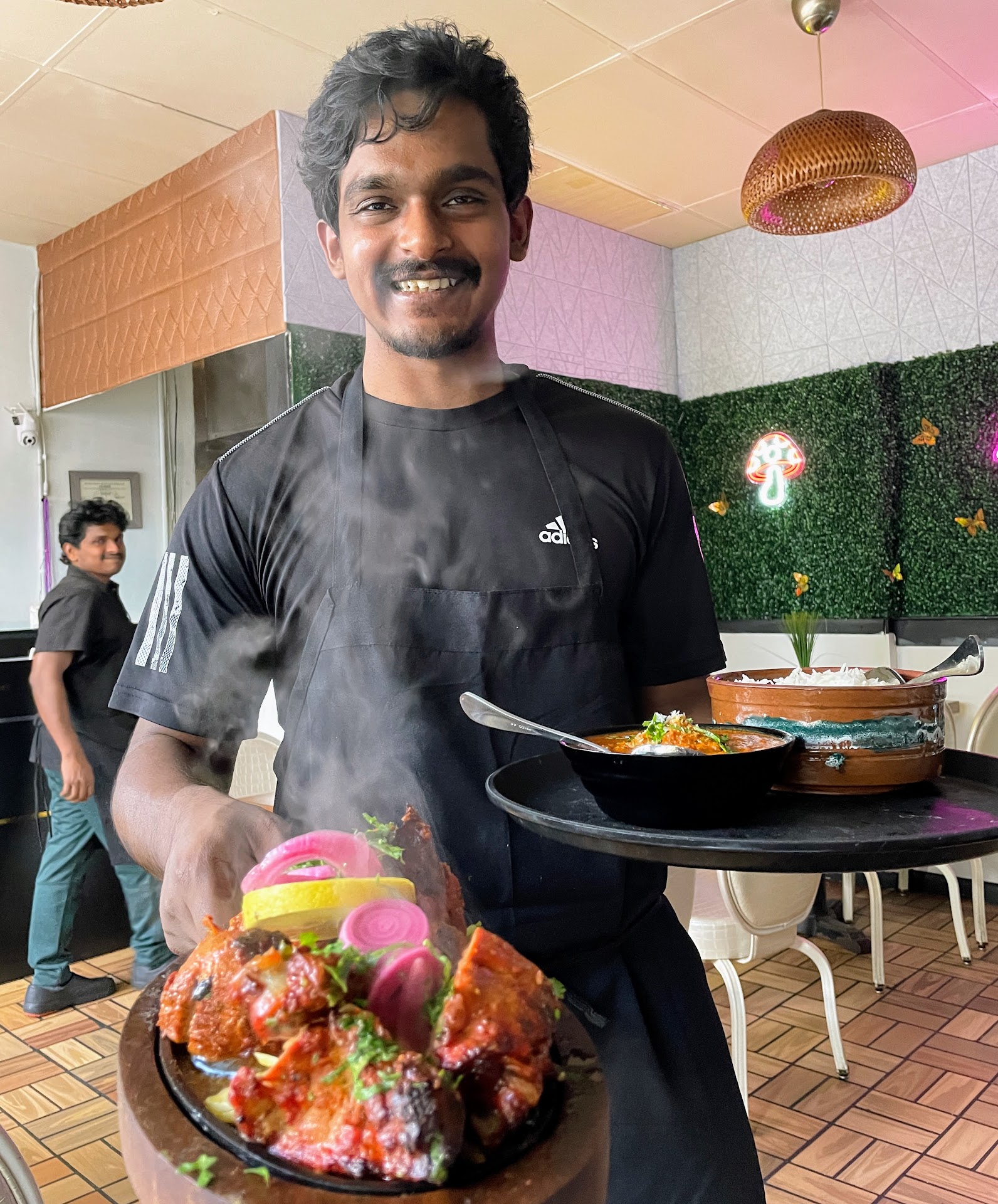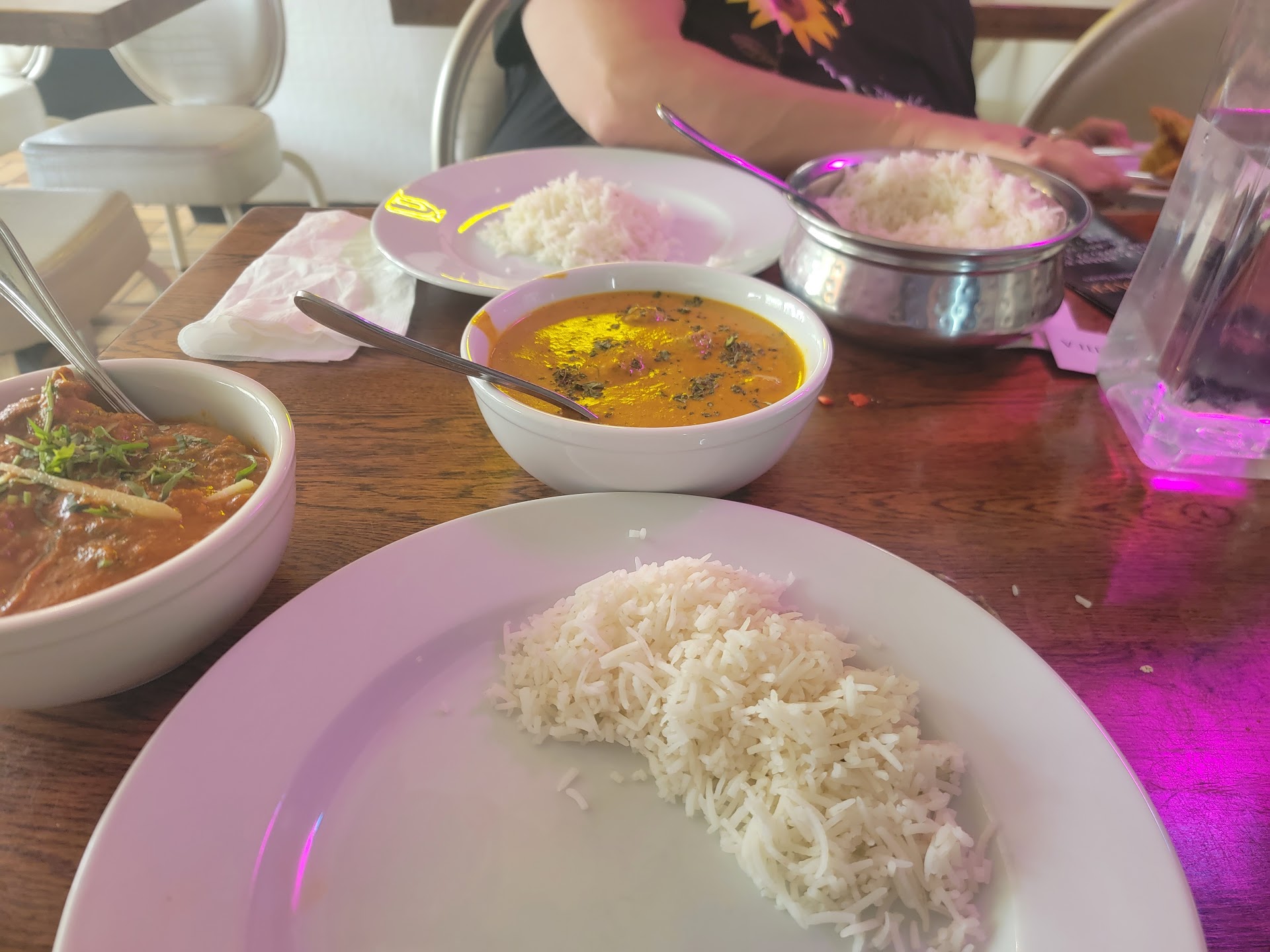 Read moreReally small space of a restaurant. Tables were tightly placed near each other, but the food was very good. While the guy who takes the order was pleasant enough, there is only that one person to take your order - and he does both online and restaurant orders so it's a bit slow on service when taking and putting in orders. We ordered Chili Paneer for the appetizer which was good, but would have been nice if they could throw the same massla into chicken and sell it as Chili Chicken. For the main course we ordered butter chicken, garlic naan and Goat Biryani. You can't go wrong with the butter chicken and garlic naan, but the goat Biryani wasn't cooked thoroughly and was extremely tough to chew. I did mention to the cook that he needed to cook the meat more to the point it falls off the bone but still juicy. The good thing is that they can adjust the level of spice accordingly. For us he made it just the right amount of spicy. Great food but room for...