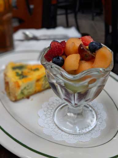 Next was the quiche that tasted about as unappetizing as it looked. It had a weird, fishy taste that rendered it inedible. If a meal isn’t composed of fish, then it should DEFINITELY NOT taste as though it does! The fruit salad that came with it looked as though it had been sitting in the fridge for awhile...but since I couldn’t eat the quiche.... and since the waitress was too preoccupied with looking at her reflection on the window....