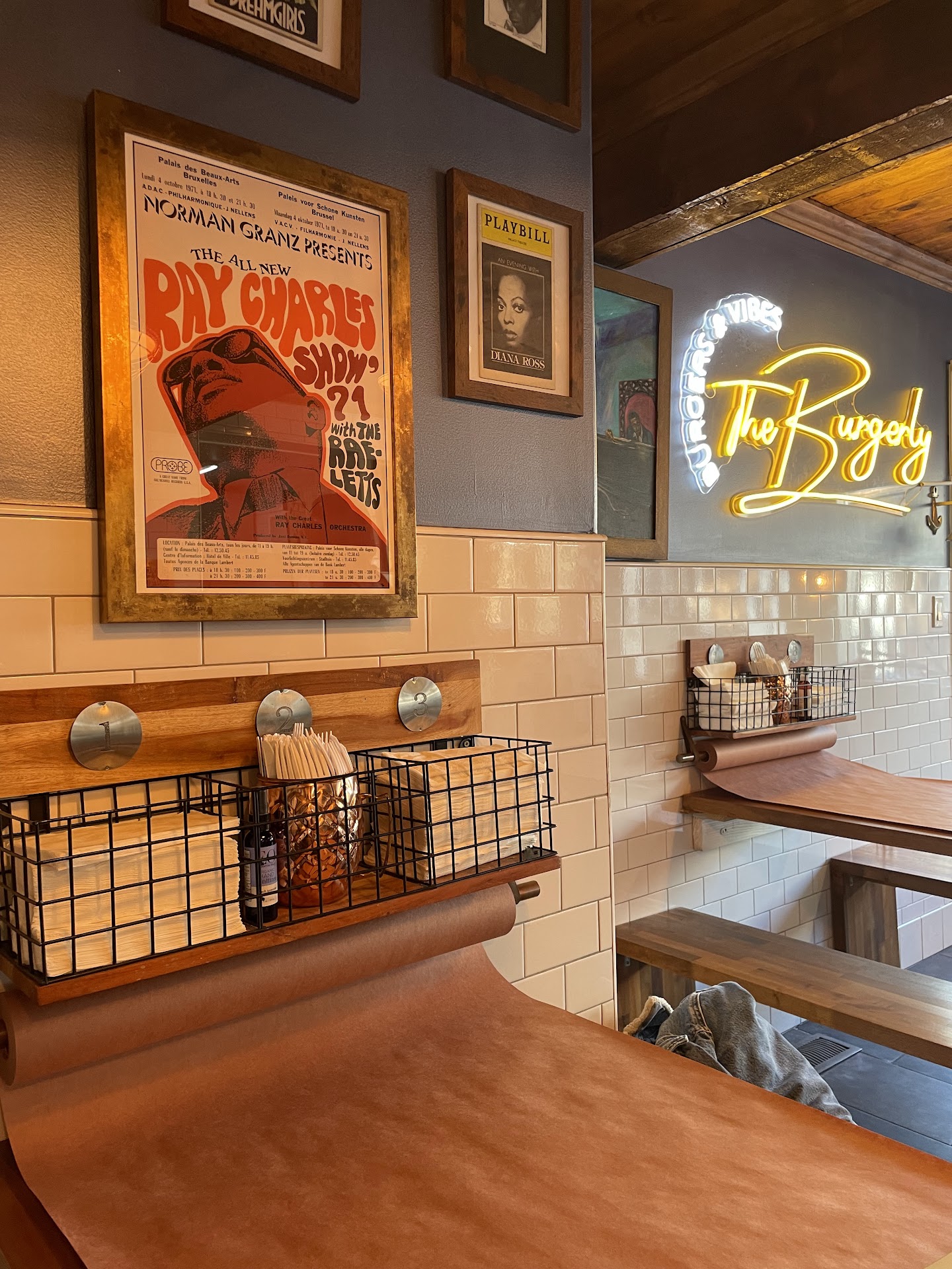 The atmosphere is fantastic. Warm Edison style lights, live edge tables and tile give the whole place a coze inviting feel. Modern LA hills style music is calming and good background music.