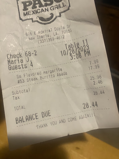 After totally being disappointed with the food and service at the original restaurant located 2 blocks down the street, I decided to give them a second chance at their new location. First, the male hostess didn’t return a smile or any kind of pleasant greeting with his, “how many”. How rude. Now, I paid $17.99 for a burrito that was just on their menu at the old location for $14.99. Never have I ever paid $17.99 for a steak burrito Asada with a tablespoon full of meat and a Burrito shell that was not even heated. I must’ve been out of my mind and stupidly hungry to agree to order this off of the menu. So I say, if you want overpriced mediocre food, by all means, El Paso is the place to be. I’m truly disappointed in that $17.99 kid plate I was served. According to the google posted menu, this meal was just $14.99. Is the price increase because they moved 2 blocks down the street into a bigger location? Shame on you charging us small town people extortion prices. And never have I ever seen a burrito the size of an enchilada. By the way, they’ve made no upgrades. It’s the same old setting. Don’t let the many cars in the parking lot fool you. The food is overpriced and super small portions. BTW our server only checked on us when we were done eating, as she could clearly see. So if we needed anything extra we clearly had to do without. Then, we sat there so long another server came to ask us if we needed anything. All we needed was the bill. So, if you were a our server and wondering why I left you a $1 tip on a $28 bill, understand young lady that you didn’t even deserve that or the small tip from the person...