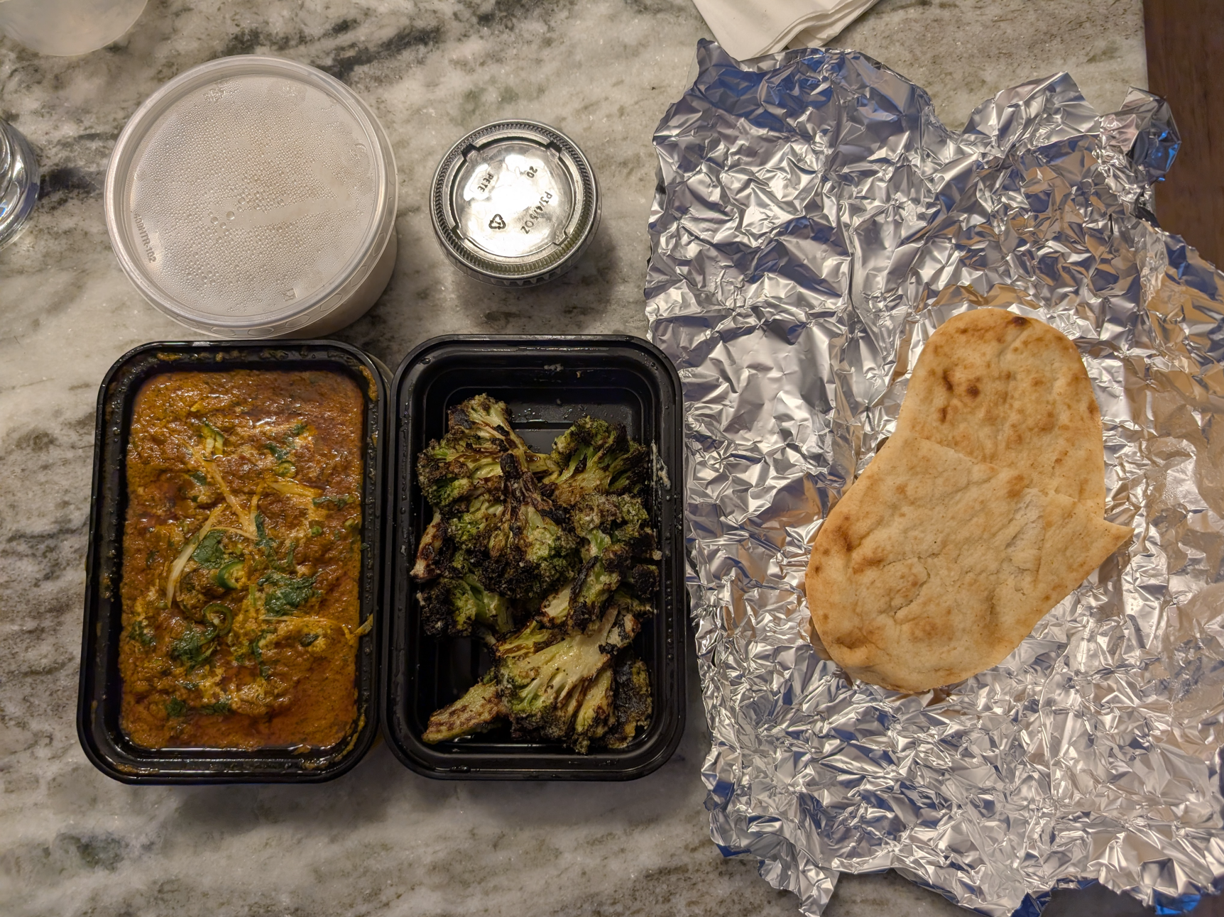 When I got home with my order, I was in disbelief with what I received. I ordered chicken roganjosh, tandoori malai broccoli and tandoori naan. The total order cost was $33.75.