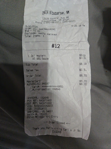 Read moreWatch out for this place...I used to go in there everyday, to get a steak burrito...very good, only, if fresh... I got my daily steak burrito fix 1 day...it was dry, not juicy, the meat was crumbly, and after inspecting it, looked so dried out, I wouldn't even feed it to my dog! I took it back, the witch working there got very hateful...and she knew I was a regular customer! I quit getting my regular breakfast, then a few weeks later, I ordered a steak burrito again...same dried out OLD food. Hateful staff, and BOTH times it was the manager...Machele... Save your $$. Just beyond this location, on the other side of the road, is another Carl's,jr. They serve fresh steak. It's at Central Ave and coors blvd...just, B4 coors blvd on the right. Don't even think about eating a biscuit here, either, at the 1st location...they're beyond dried out...hard as a rock, but the cute little birds love them... I don't go to a "restaurant" for bird food!! Do you? Or dog food. Beware of even stopping here. Bad food, hateful staff. And they don't care if they're so many many other places to stop and get good...