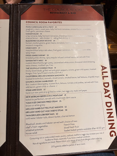 Read moreIf possible I'd give this joke of an establishment ZERO stars!!!! I play poker a lot and don't have much time (45 mins) to go upstairs so council room is the alternative to eating the snack bar food at the other restraunts. Last few times have NOT been good but edible. However, last night I ordered the meat loaf with gravy on side,, baked potato and vegtable. They didn't put the gravy on the side which has mushrooms in it. Not only did they not do that, the meatloaf was dryer than dirt and they didn't include all the stuff on and for the potato. I called about it told the girl the situation. She said they would remake and she would put my name down. The following day (today) I called to order once again playing poker. They claimed to not know and had me explain the whole situation again. Then they stated they would only give me a baked potato (coming from some sort of manager) I asked to speak to the main manager at this point I was already annoyed to the max. He never came on they just said they would give me equal value to my order $20. I ordered the jumbo shrimp $27 + tax. I went to go pick up the order and they gave me the order and didn't charge me. I was under the impression they were making up for THEIR mistake. So I came back to the poker room. 40 minutes pass by and security guard comes with a ticket lmao for $8. The shrimp was also GARBAGE. Their food is a representation of their managers HORRIBLE. I spend thousands at sandia so its a total joke will never give council trash a penny again. AVOID AT ALL COSTS!!! THEY ARENT EVEN 4 STARS...