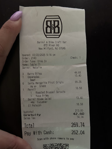 Read moreBarrel & Brew Craft Bar and Restaurant left us quite disappointed. We arrived at 9:15 pm and didn’t eat until 11:15 pm. Luckily the DJ was great and we made the best of it but the amount of excuses we got from various servers in regards to why our meal was delayed was ridiculous. First it was because they had multiple birthday parties and the kitchen was backed up. Then it was because a new system had erased our orders so they took it again. There was no excuse for why they charged $99.36 for 6 glasses of Pinot or why we paid a BOLD $42.60 gratuity for a party of 3. They never offered a bottle of wine versus a glass but not sure if that would even have mattered. They tried to make up for the wait with three tequila shots and a lame joke about how even though our food took long we got free shots. Most of the staff was very unprofessional and dismissive. When we finally got our food one of the staff members opened the door and left it open while we were at the front of the restaurant trying to eat our late dinner. The atmosphere was nice and the food wasn’t bad or expensive but almost feels like they prolonged our dinner so we would keep ordering $16.50 Pinots. And no prices for drinks are not listed on the menu … won’t be going back to this strip mall overpriced spot. So no need to offer your free appetizer or 40%...
