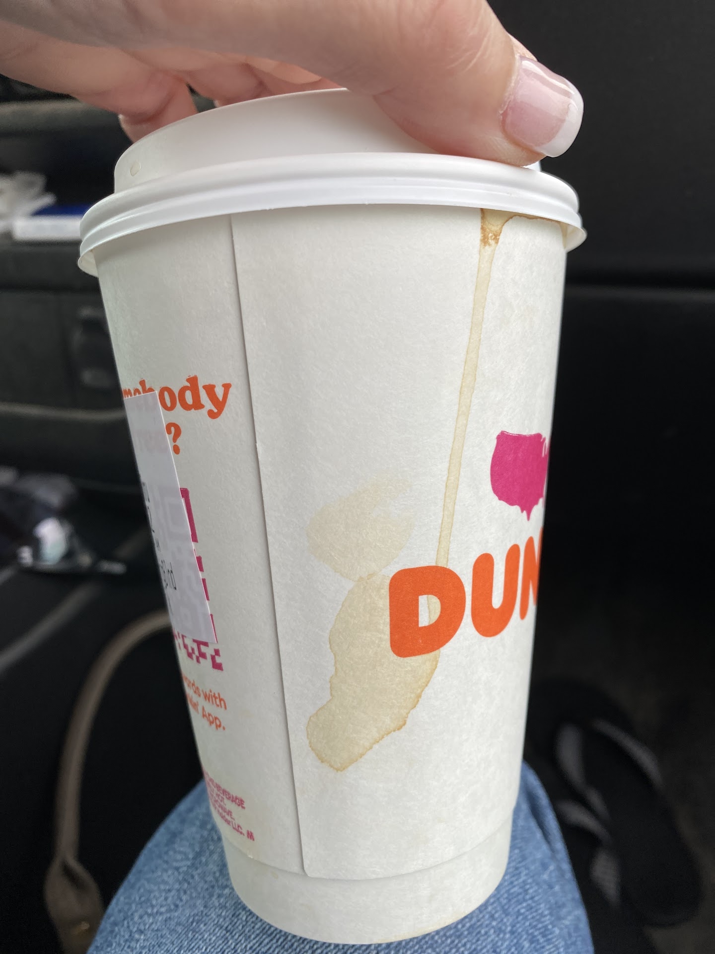 Read moreEvery weekday at 6 AM I stop at this Dunkin for a coffee & breakfast sandwich on a bagel. But no more the last few months they have gone down hill drastically. Bagels are like a rock, the coffee is burnt, full of grinds, made wrong or all of the above & then the woman who hands you your order at the drive thru holds the items just outside the window & above her head so I have to put my car in park & reach as far as I can just to receive my order just to have the coffe spill down my arm. Dunkin needs QA here desperately. As for me I will never come here again, I'm going to Bagelman where I know the food won't...