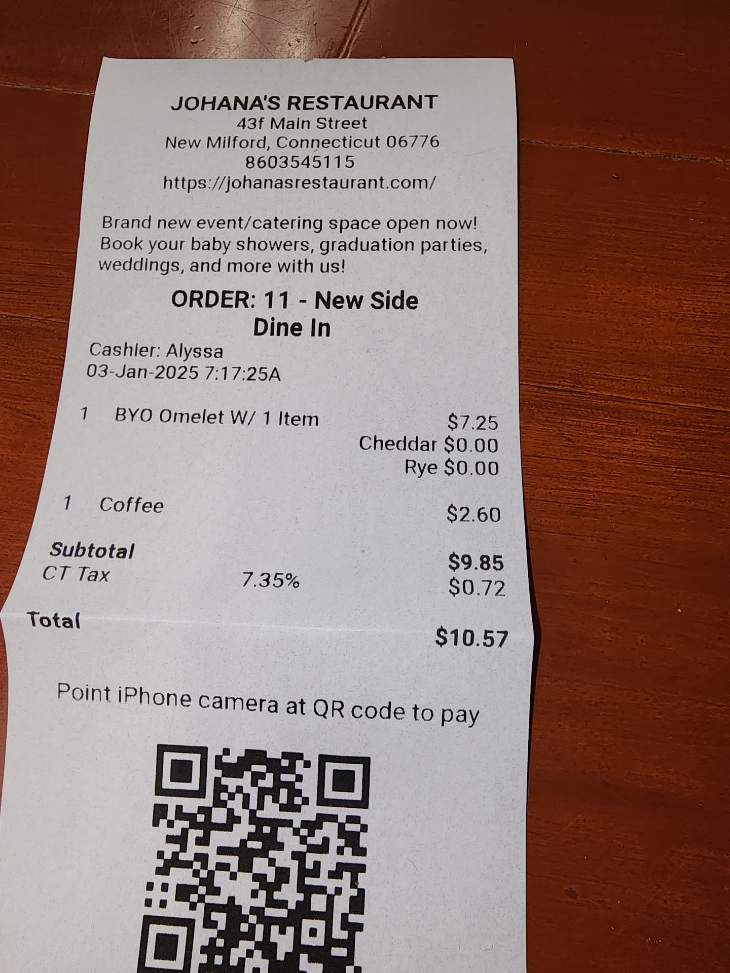 Read moreLast day before work gets crazy for me. Decided to stay local and go to Johanaâs. They have expanded the inside to fit more people. They have the outside patio that would be nice when the weather warms up. Plenty of free parking, located on the New Milford Green. Even on a Sunday there was no wait. It was crowded but there was still seating. The staff was all polite and attentive. Great menu choices at a good price. I got the Torta de Huevo. Everything I love in an omelette, including a little spicy sausage. Deliciously seasoned home fries. I sampled a little of my fiancĂ©âs blueberry pancakes. Iâm not a huge fan of blueberries, but these pancakes were made from scratch with fresh ingredients. A definite winner. Another bonus is how you pay. There is a QR code right on the receipt. No need to wait for the waitress to come back. You pay right at the table, leave a generous tip, and walk out. Definitely give Joannaâs a try if you have...
