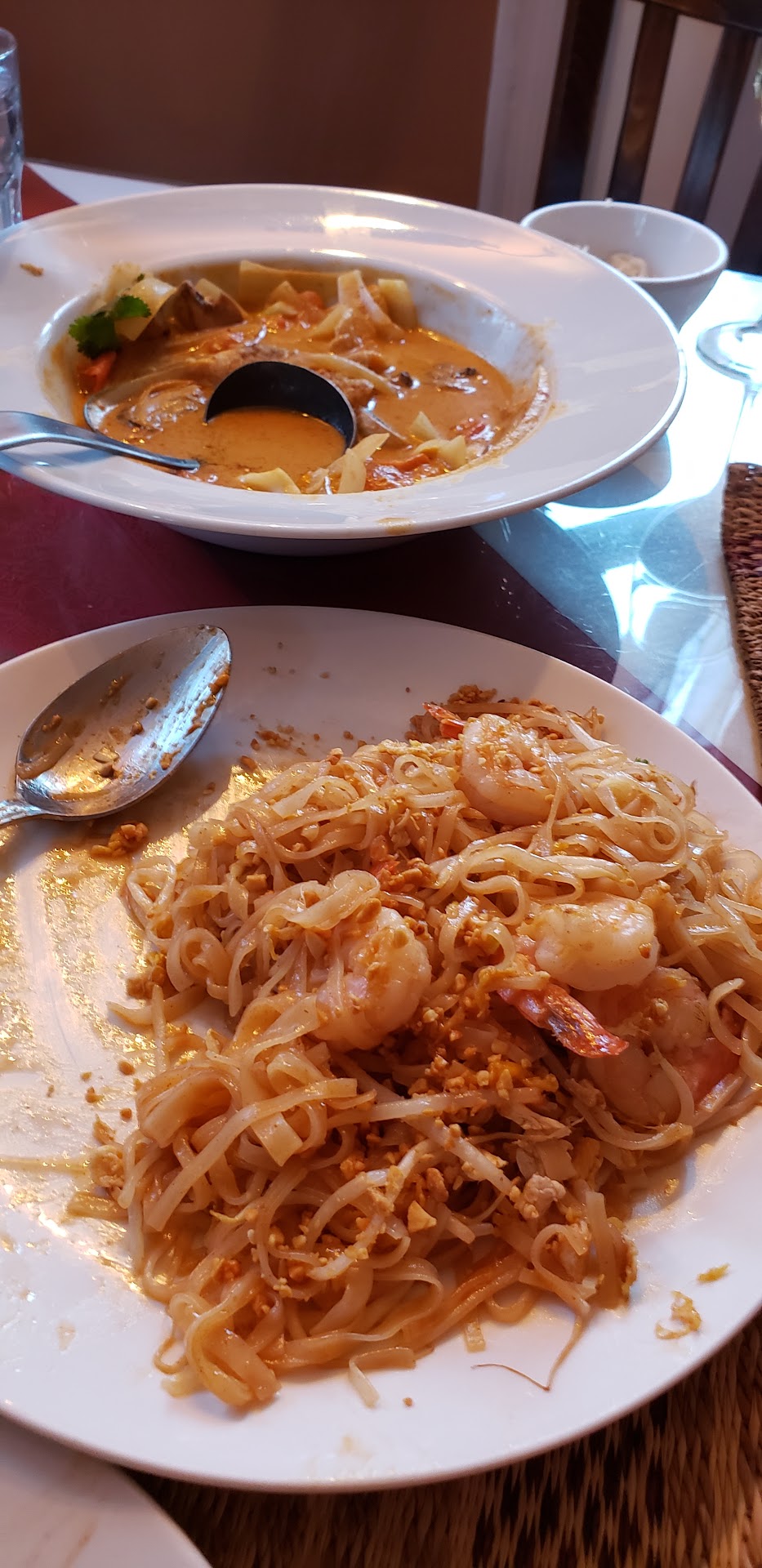 We liked the food here. Best Thai place in the area we have found. We asked for one of our dishes to be made less sweet and extra spicy. They got it right (most places fail on this request). That was the Basil Beef. The Yellow curry we left just as they would normally serve it. It was good veg and meats and tasted good. A little too sweet, but that is normal for most american thai food.
