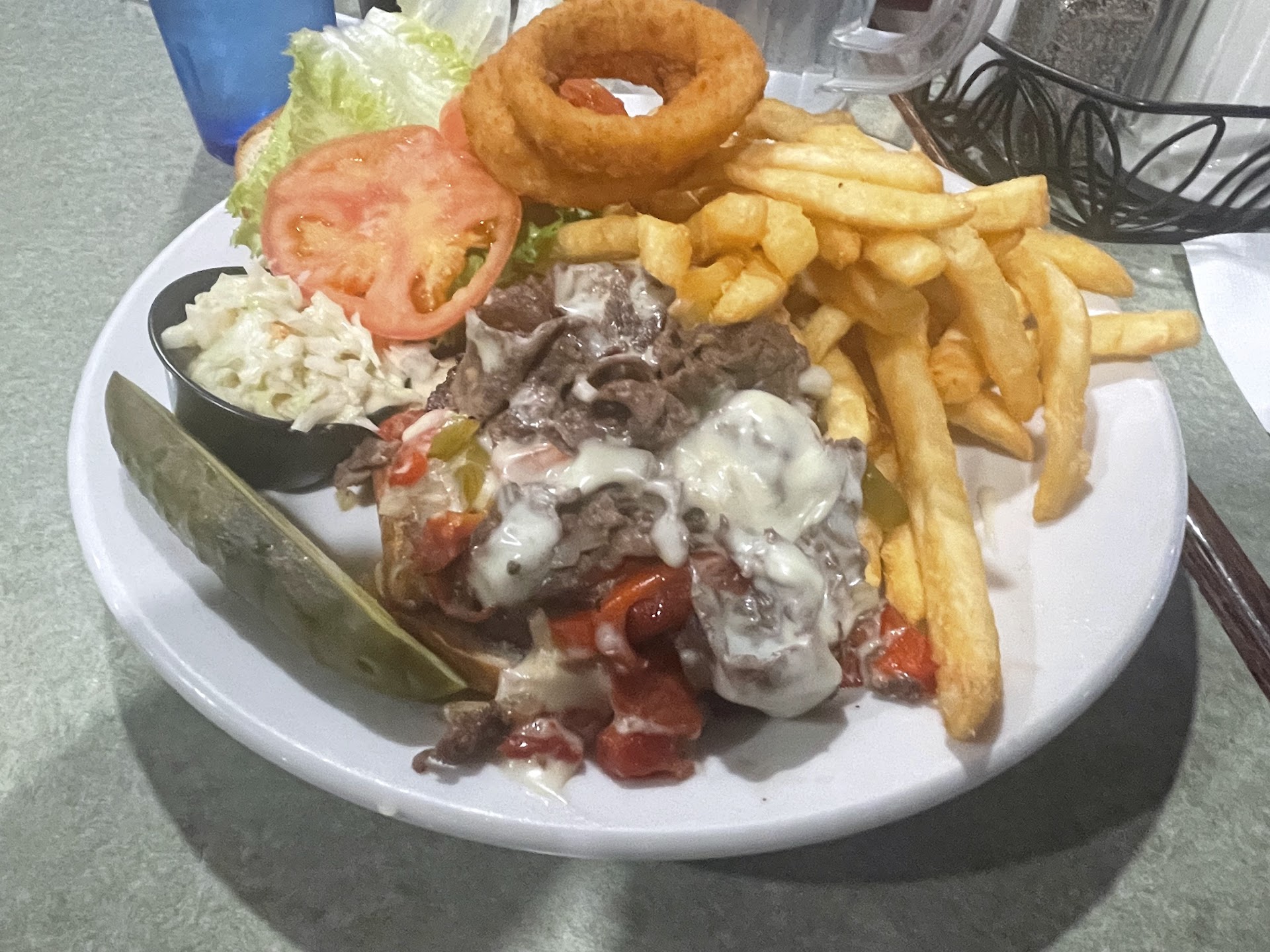 The food here is great. Any burger selection comes with two onion rings. The fries are some of the best I’ve ever had anywhere. We started with a loaded waffle fries and mozzarella sticks. Both great starters. The cheese on the waffle fries was spread throughout just not on the top. Almost every fry had a topping. I got the Philly Cheesesteak Burger. It was cooked exactly how I wanted. When you look at the picture, it seems like possibly too much. Once you put on the top bun, it creates a cohesive unit of deliciousness. As good as it was, I want to try a different burger next time. I heard good things about some of them. I highly suggest stopping in here if you are in...
