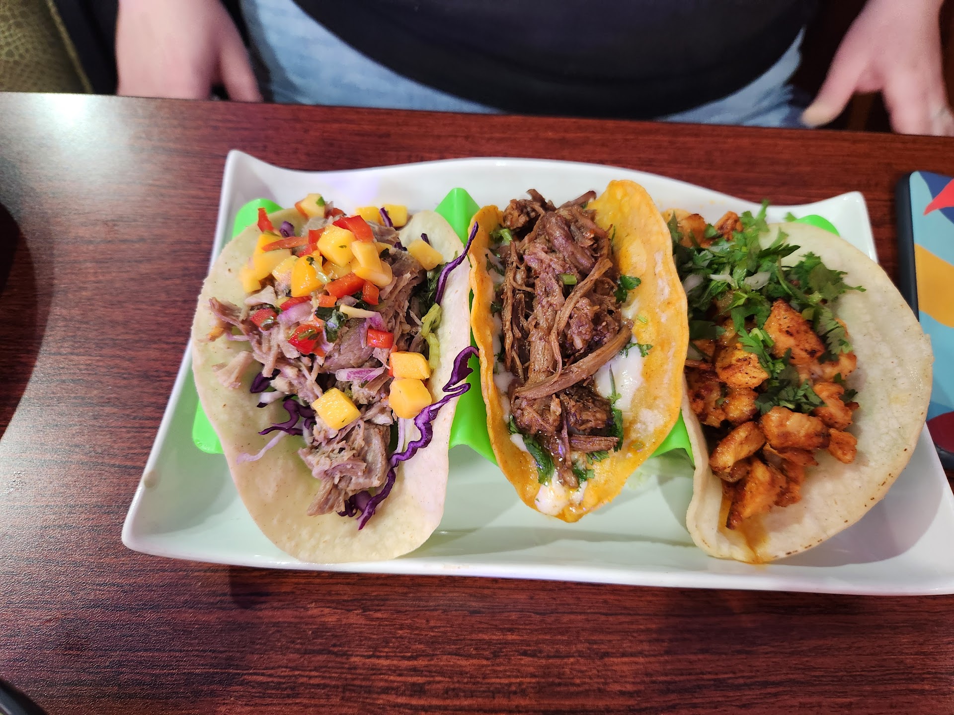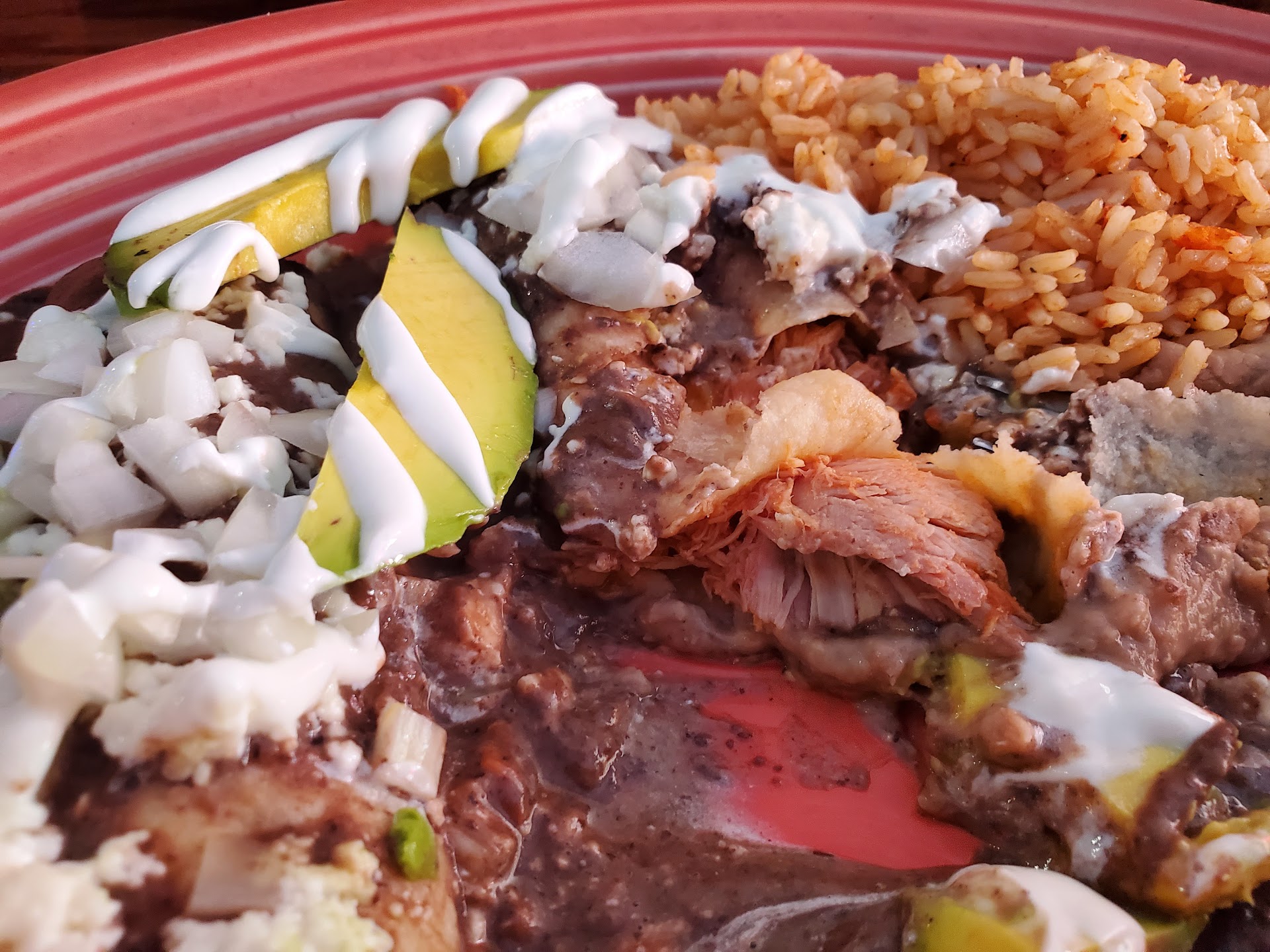 Ground beef shredded chicken or cheese served with rice and beans. I got the chicken but am sur, whatever your choice, ly is just as good. Enjoy yourself! You can't go wrong for the atmosphere, authenticity, and the...