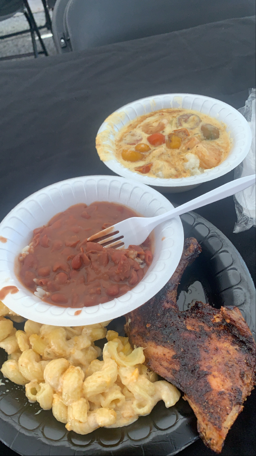 Here is what we ordered: Jambalaya Pasta, BBQ Meatballs, Crawfish Quesadillas, Sweet cornbread muffins, Vegan Dirty Rice, Roasted Grilled Vegetables, Crispy Fried Fish, Jerk Chicken, Red Beans & Rice, Roasted Corn, Mini-Vegan Stuffed Bell Peppers, and Season Fruit Trays.